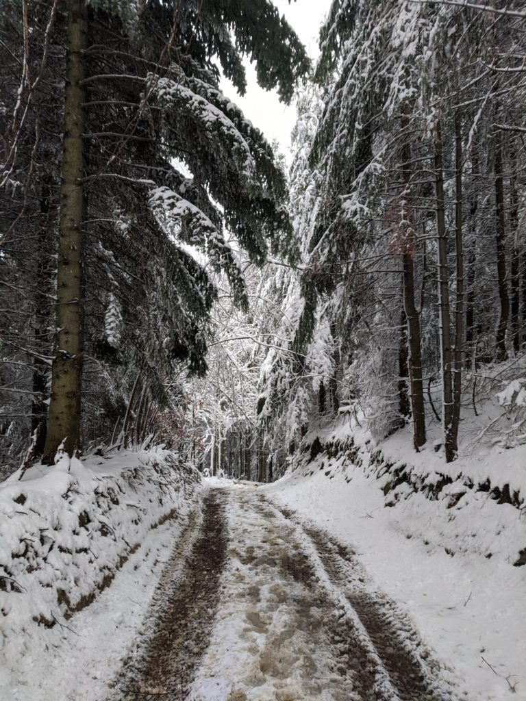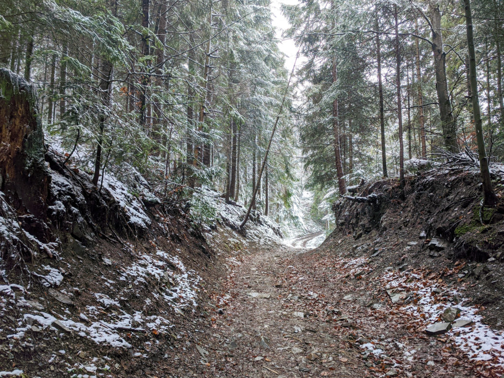 Po dotarciu na Przełęcz Wierch Młynne kierujemy się w prawo i polną drogą idziemy zgodnie z oznakowaniem czerwonego szlaku. Po chwili wkraczamy do lasu, a nachylenie terenu coraz bardziej wzrasta. Kroczymy po leśnej ścieżce, powoli nabierając wysokości. Przed nami pierwsze, z dwóch bardziej stromych podejść na czerwonym szlaku. Po około 25 minutach marszu docieramy do Wierchu Lelonek (955 m n.p.m.). Stąd przy dobrej widoczności dostrzec można już wieżę na Gorcu, Lubań oraz Mogielicę. My niestety nie widzimy tym razem nic, opady śniegu i mała widoczność zdecydowanie nie sprzyjają podziwianiu panoram.