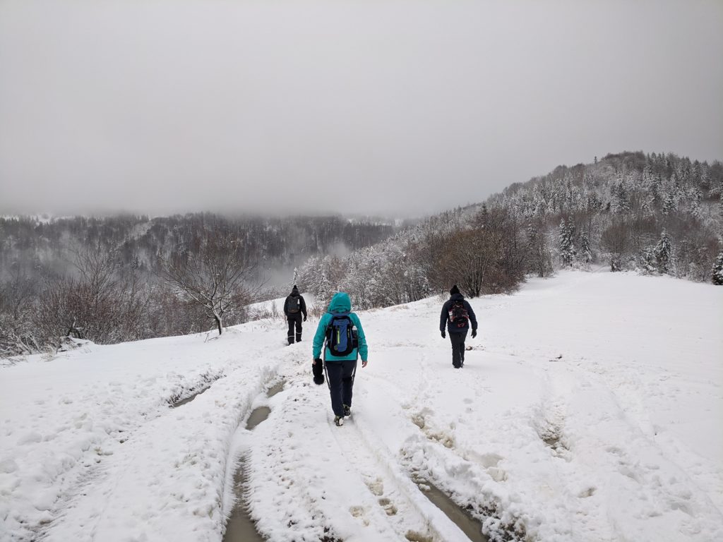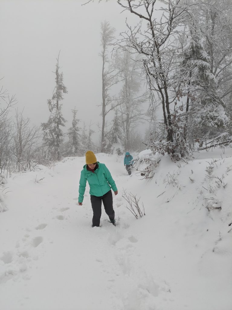- Zimą na wędrówkę należy zabrać odpowiednio ciepłą odzież, rękawiczki, czapkę. Przydać się może chusta lub buff, aby osłonić twarz przed wiatrem.