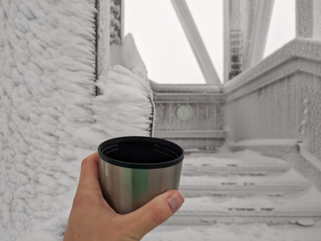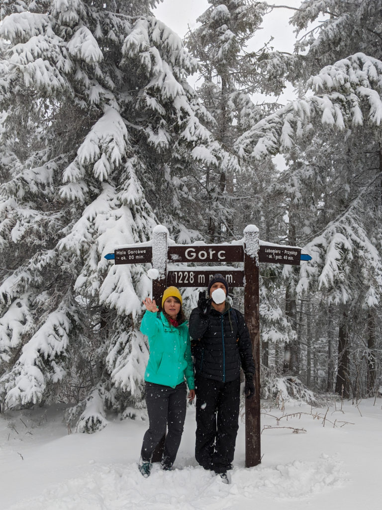 Po przejściu przez polanę na Wierchu Lelonek ponownie wkraczamy do lasu i dość szybko nabieramy wysokości. Czeka na nas drugie, strome podejście na szlaku oraz niesamowita zimowa aura, która zagościła w Gorcach na Święta Bożego Narodzenia. Opady śniegu nie ustępują, a momentami zapadamy się w nim aż po kolana 🙂 Po 40 minutach wędrówki i przecierania szlaku docieramy do rozwidlenia szlaków. Tu skręcamy w prawo zgodnie z oznaczeniem trasy oraz strzałką kierującą nas na wieżę widokową na Gorcu. Z tego miejsca mamy jeszcze 300 metrów wędrówki na szczyt. Maszerujemy czerwonym szlakiem, aż do skrzyżowania ze szlakiem niebieskim, którym dotrzeć można na Gorc z Rzek. Na skrzyżowaniu kontynuujemy wędrówkę na szczyt już niebieskim szlakiem. Po bardzo krótkiej wędrówce niebieskim szlakiem, po naszej lewej stronie zza drzew wyłania się sylwetka wieży widokowej na Gorcu. Tym samym po niespełna dwóch godzinach od wyruszenia z Zasadnego, stajemy na szczycie Gorca.