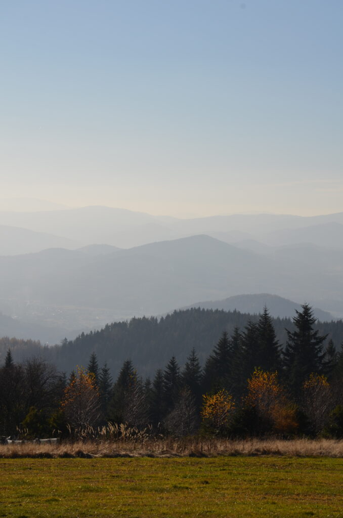 Koskowa Góra ma wysokość 867 m n.p.m. i jest rozległym, bezdrzewnym szczytem. Z racji tego, że jest jednym z najlepszych punktów widokowych w Beskidzie Makowskim, rozciągają się z niej piękne panoramy. Fantastyczne widoki można podziwiać zarówno w kierunku zachodnim, jak i północnym. Na szczycie znajdują się dwa przekaźniki telekomunikacyjne, które nie wyglądają zbyt uroczo, jednakże gdzieś musiały zostać postawione 🙂 Jest także ławka oraz miejsce na ognisko. Warto zejść żółtym szlakiem w kierunku zachodnim, na polankę widokową pod Koskową Górą. Widoki stamtąd są prima sort!