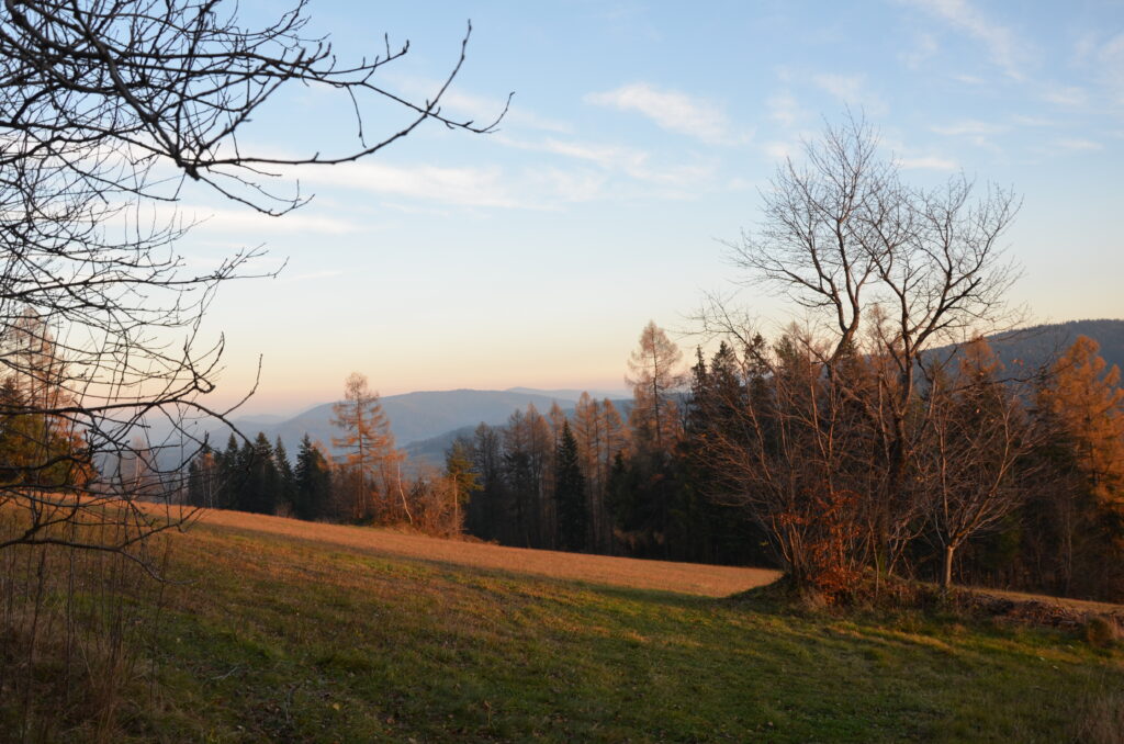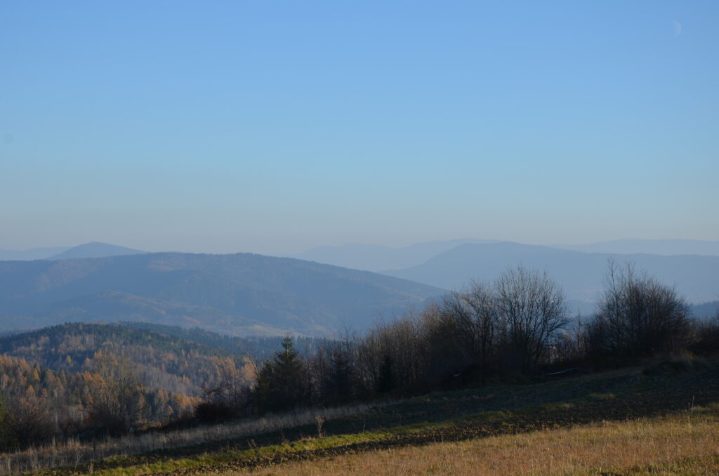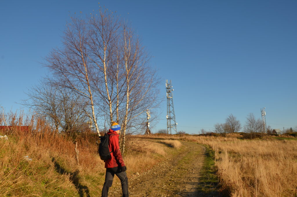 Wędrówkę rozpoczynamy w miejscowości Skomielna Czarna, gdzie znajduje się niebieski szlak, który poprowadzi nas w stronę Koskowej Góry. Nasza trasa zaczyna się przy głównej drodze, a punkt, w którym startujemy, jest oznaczony na mapie turystycznej jako „Rola Jabconiowa„. Początkowo maszerujemy asfaltową dróżką wzdłuż gospodarstw. Po chwili asfalt kończy się, a my wkraczamy na szeroką, polną drogę. Już po kilku minutach marszu dookoła nas pojawiają się piękne widoki. Za plecami mamy szczyty Groń i Stołowa Góra. Na wschodzie pojawiają się szczyty Beskidu Wyspowego, a na zachodzie widok na szczyty Beskidu Makowskiego oraz Beskidu Żywieckiego.