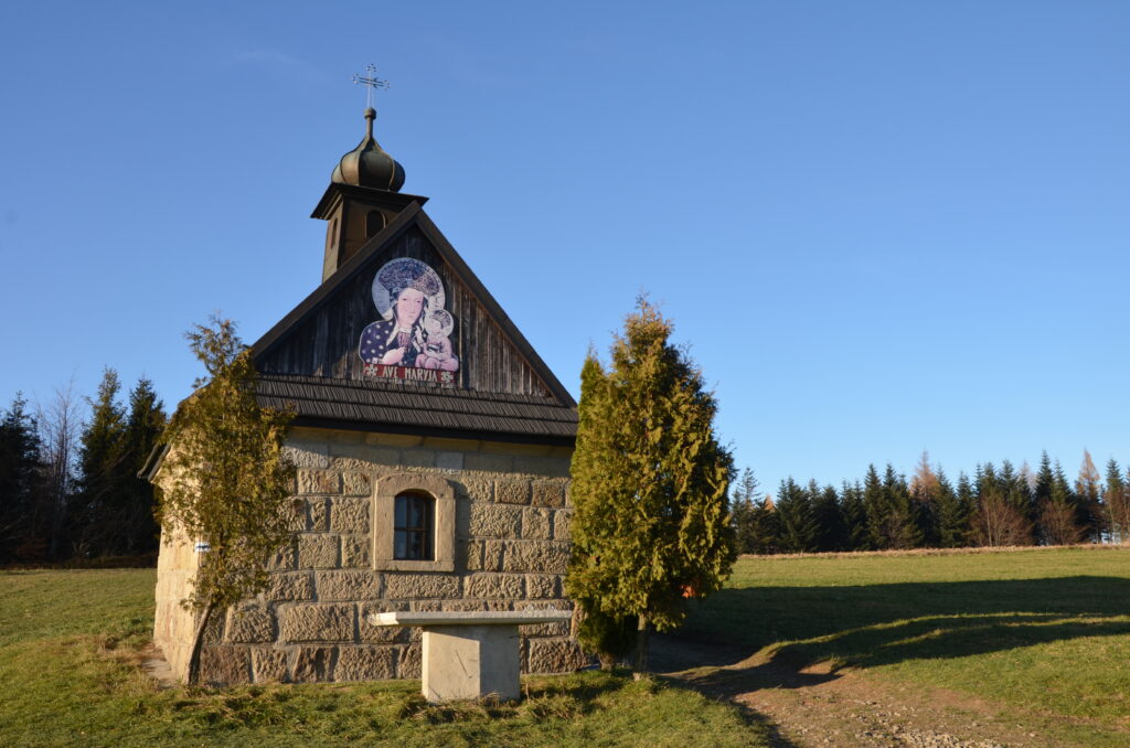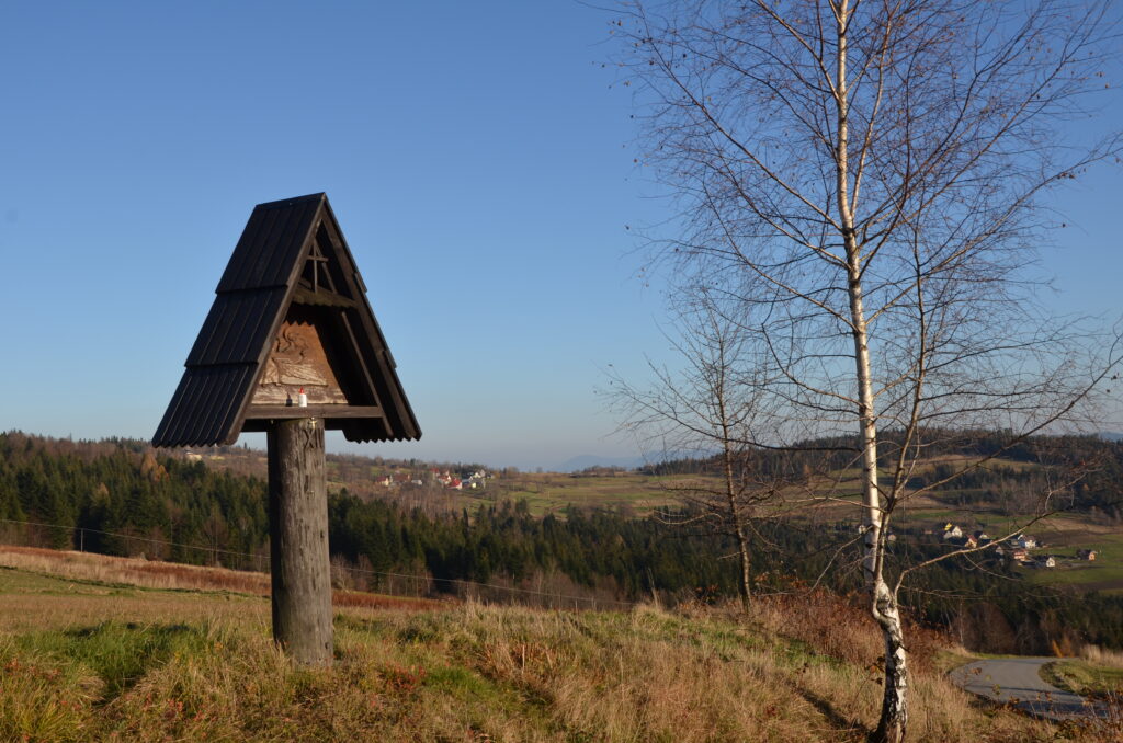Z Koskowej Góry schodzimy tą samą drogą do skrzyżowania szlaków niebieskiego z żółtym. Skręcamy w lewo i niebieskim szlakiem, który wiedzie po asfaltowej drodze, idziemy w kierunku murowanej kapliczki. Kapliczka pod Koskową Górą znajduje się na przełęczy i jest dość charakterystycznym punktem w okolicy. Roztaczają się stamtąd przepiękne panoramy na Beskidy i Tatry. Z całą pewnością warto tu zajrzeć, będąc na Koskowej Górze.