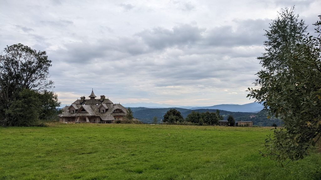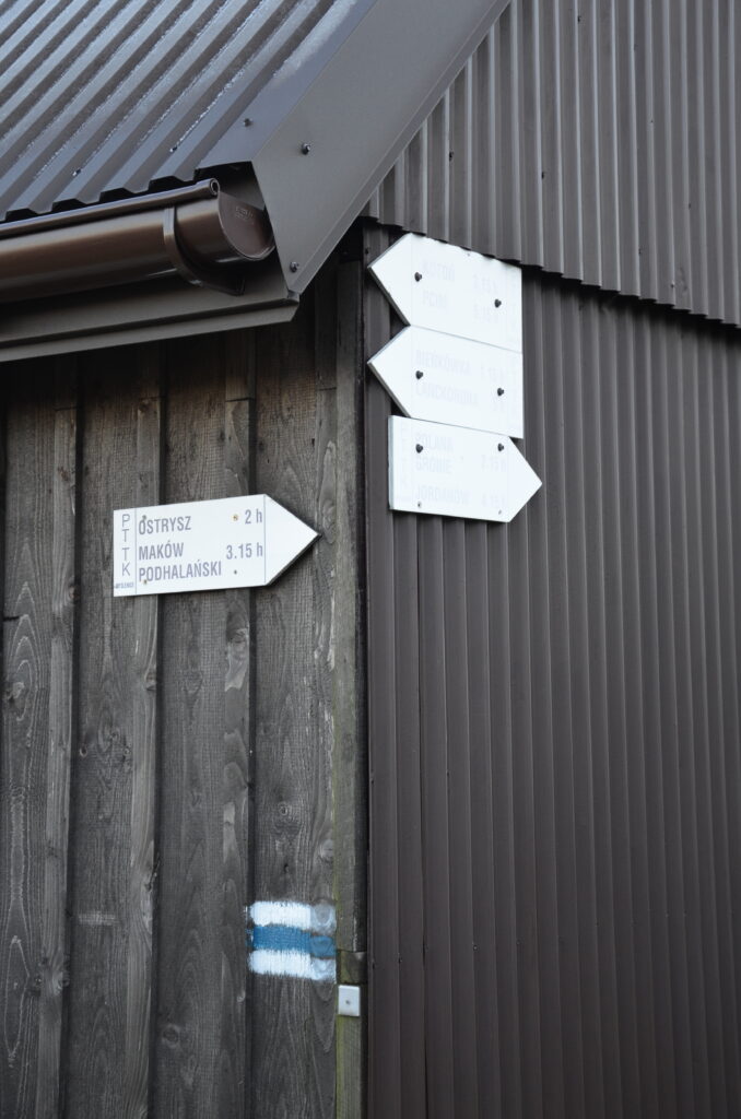 Mniej więcej po 1 godzinie i 30 minutach ponownie na szlaku pojawia się asfalt, a my docieramy do gospodarstw, które znajdują się nieopodal Kapliczki pod Koskową Górą. Po prawej stronie mamy piękny widok na Gorce i Beskid Wyspowy. Jeśli wychylimy się trochę mocniej w prawo, to za zabudowaniami zobaczymy Tatry. Zanim jednak udamy się na punkt widokowy na Tatry, to uprzednio wejdziemy na Koskową Górę.