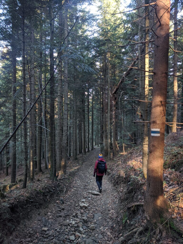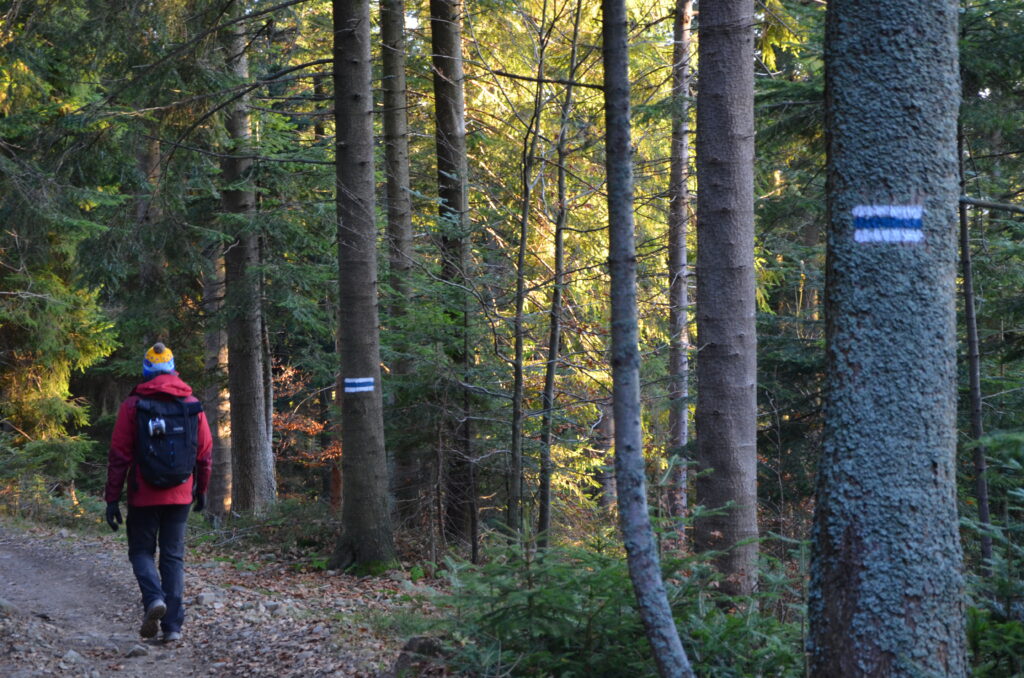 Kolejna część trasy to wędrówka przez las. Szlak prowadzi nas na zmianę: raz po dość płaskim terenie, raz wymusza podejście pod górę. Trasa od czasu do czasu prowadzi także w dół, nie ma więc nudy! Mijamy co jakiś czas małe polanki widokowe, z których roztaczają się bardzo ładne panoramy. Ze względu na to, że jest to mało popularny szlak, można w spokoju wędrować i cieszyć się bliskością natury.