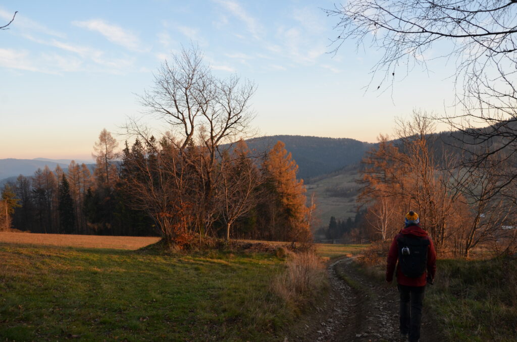Z okolicy kapliczki wracamy do punktu wyjścia dokładnie tą samą trasą. Marsz umilają nam piękne widoki oraz promienie zachodzącego słońca, które prześwitują pomiędzy drzewami. Cała trasa jest bardzo przyjemna i z całą pewnością będzie świetnym pomysłem na krótki wypad za miasto 🙂