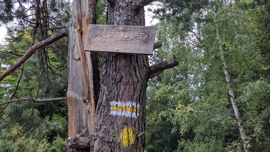 Aby dotrzeć na szczyt, należy z niebieskiego szlaku skręcić w lewo na żółty szlak, który prowadzi między innymi na Ostrysz. Ruszamy żółtym szlakiem, mijamy ostatnie gospodarstwa i po zaledwie kilku minutach docieramy do celu.