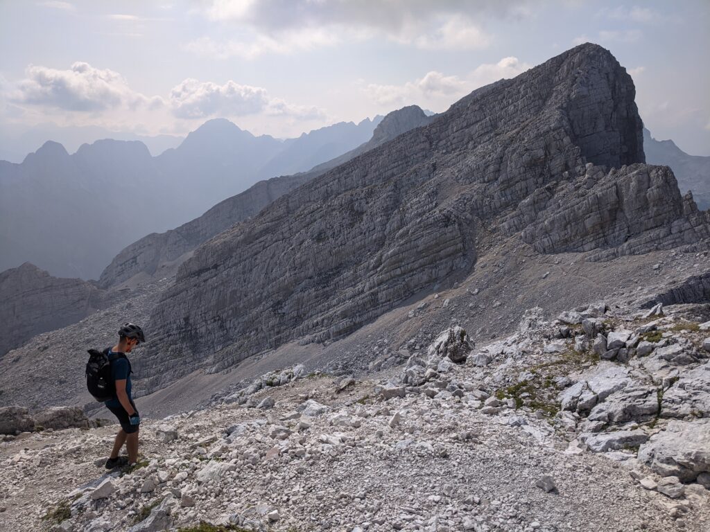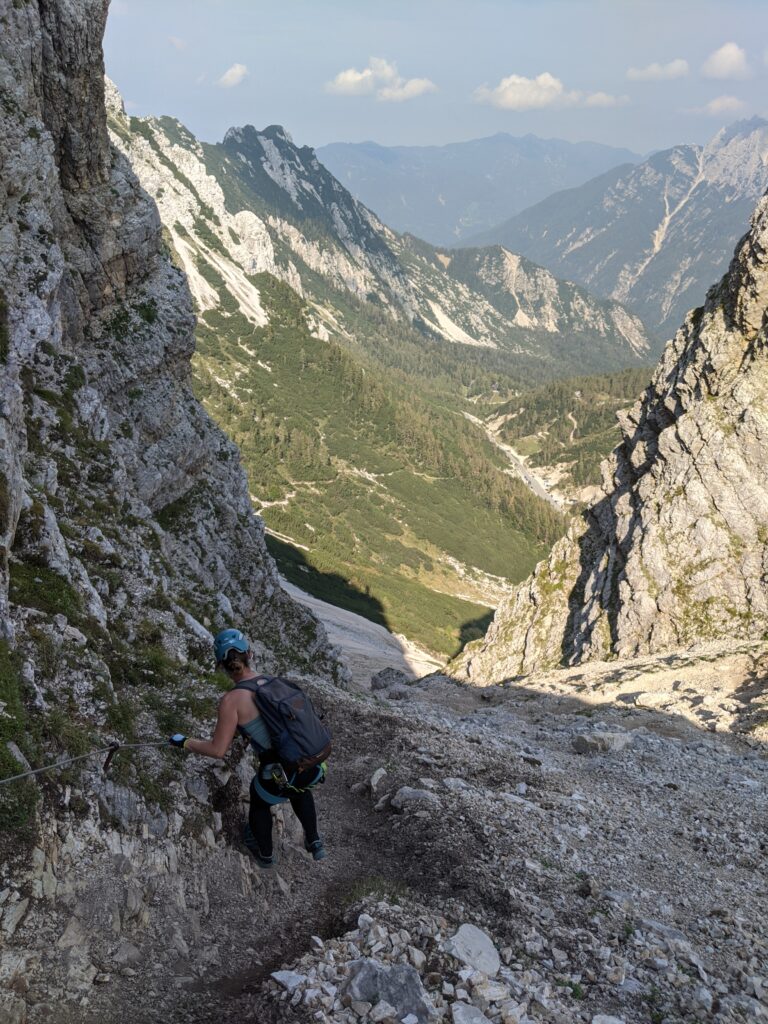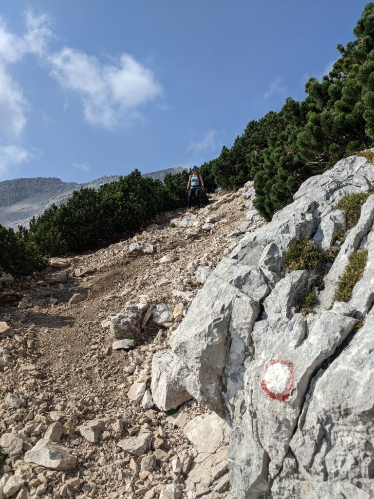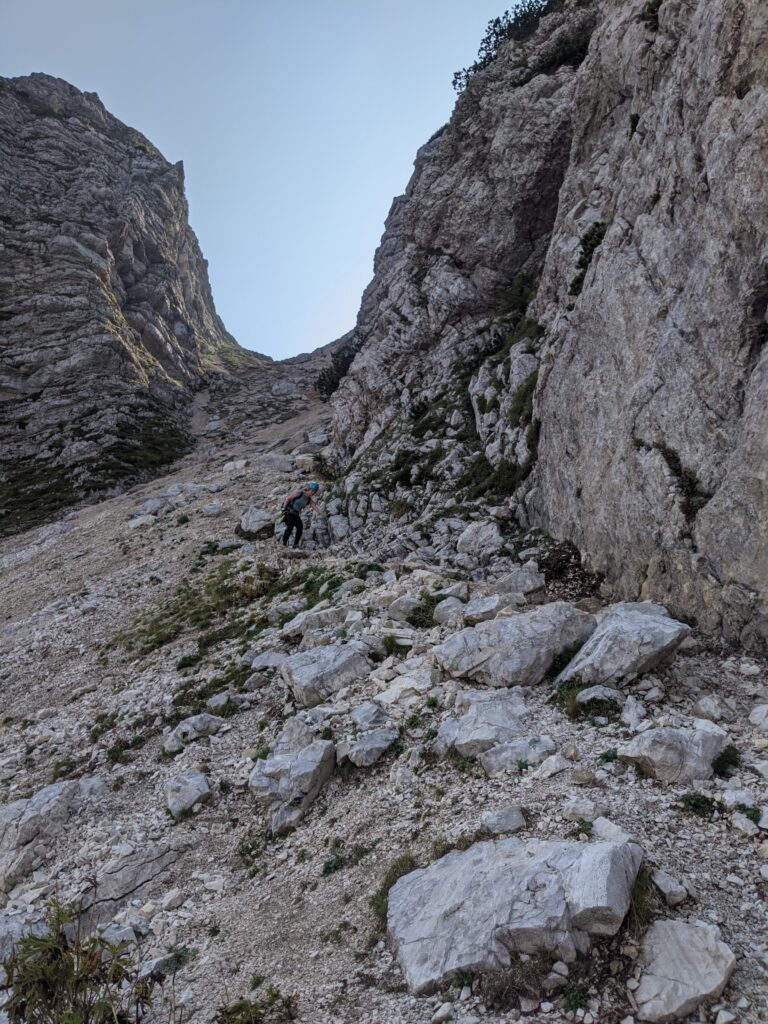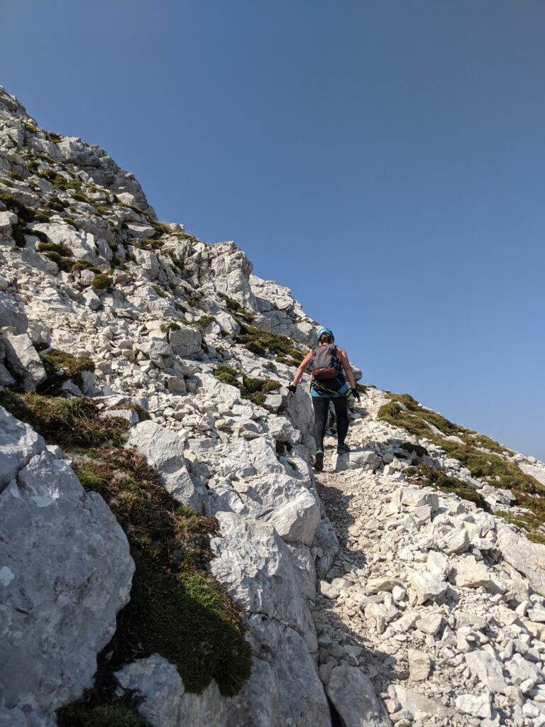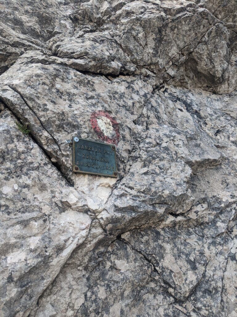 Trawersujemy północne zbocza Šitna glava i Mojstrovka, podążając za dobrze oznaczoną trasą. Szlak prowadzi nas spokojnie pod górę. Podobnie jak wcześniej — początkowo idziemy wygodną, stabilną ścieżką, która po chwili zamienia się w sypkie piarżysko. Po kilku minutach marszu, na ścianie widzimy wspinających się ludzi — początkowo myślimy, że to już „nasza” ferrata, jednakże jest to droga wspinaczkowa dla osób bardziej zaawansowanych. Prowadzi ona na szczyt Šitna glava. Po 20 minutach docieramy do początku via ferraty Hanzova pot. Myślę, że jeśli nie będziecie robić co chwilę zdjęć i analizować pobliskich szczytów górskich, to ten czas przejścia będzie krótszy 🙂