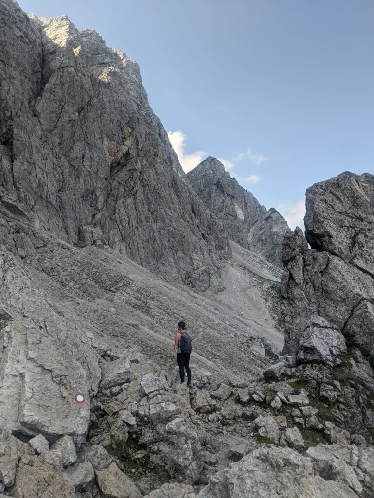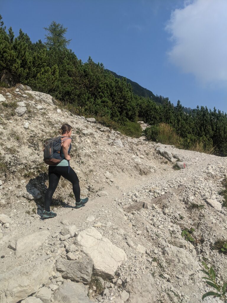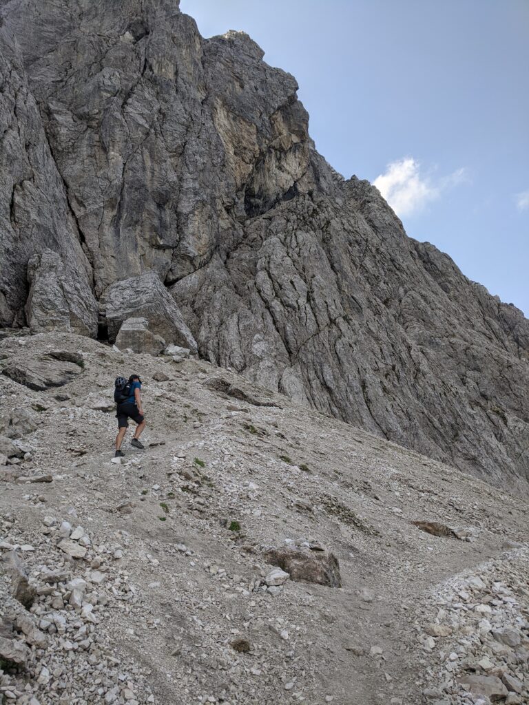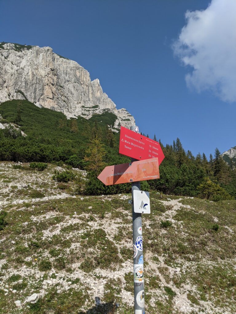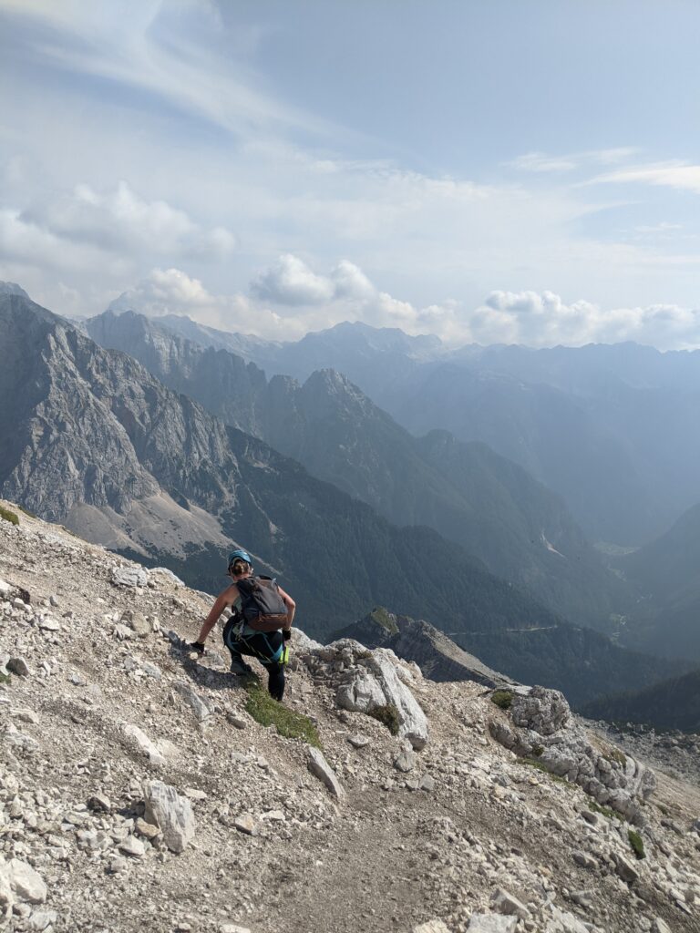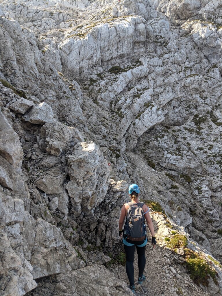 Trawersujemy północne zbocza Šitna glava i Mojstrovka, podążając za dobrze oznaczoną trasą. Szlak prowadzi nas spokojnie pod górę. Podobnie jak wcześniej — początkowo idziemy wygodną, stabilną ścieżką, która po chwili zamienia się w sypkie piarżysko. Po kilku minutach marszu, na ścianie widzimy wspinających się ludzi — początkowo myślimy, że to już „nasza” ferrata, jednakże jest to droga wspinaczkowa dla osób bardziej zaawansowanych. Prowadzi ona na szczyt Šitna glava. Po 20 minutach docieramy do początku via ferraty Hanzova pot. Myślę, że jeśli nie będziecie robić co chwilę zdjęć i analizować pobliskich szczytów górskich, to ten czas przejścia będzie krótszy 🙂