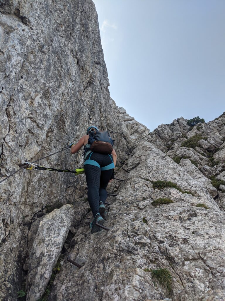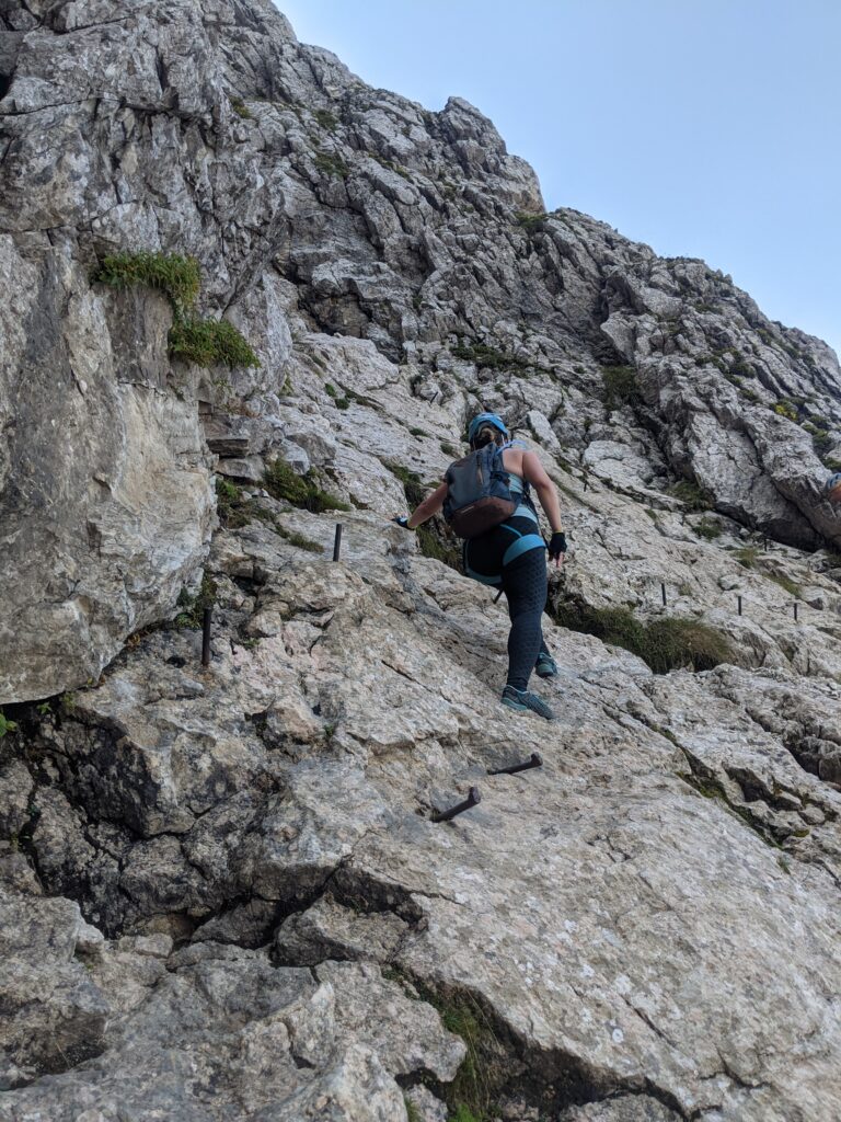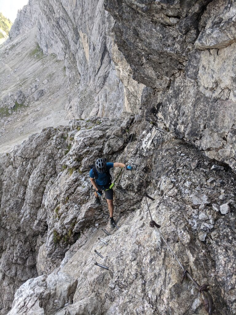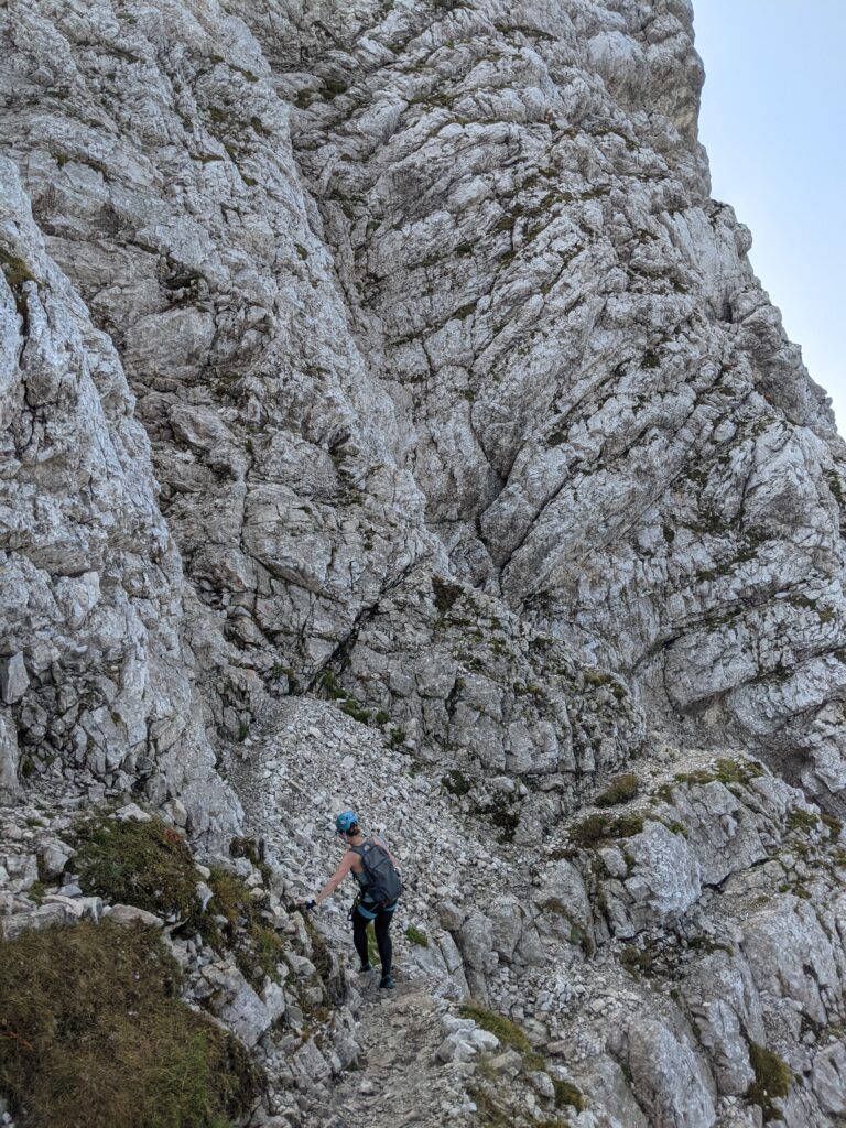 Kolejno znów będziemy wchodzić po ubezpieczonych i nieubezpieczonych fragmentach trasy, a po 10 minutach dotrzemy do bardzo mocno eksponowanej i wąskiej półki skalnej. Jest to kolejny „mocniejszy” fragment ferraty. Bardzo ciekawy i przyjemny, będący zarazem świetnym urozmaiceniem trasy. Następnie będziemy przechodzić kominkiem skalnym, który jest mocno eksponowany i znajduje się na wschodniej ścianie. Po wyjściu z kominka szlak jest równie ciekawy, ponieważ przejść musimy po wąskiej skalnej grzędzie, która nie jest ubezpieczona w żaden sposób. Tu zdani jesteśmy wyłącznie na siebie, na własną równowagę i spokojne przejście blisko ściany 🙂 Kawałek za grzędą skalną, szlak staje się ponownie ubezpieczony, a my skręcamy mocno w lewo i wkraczamy do wysokiego żlebu.