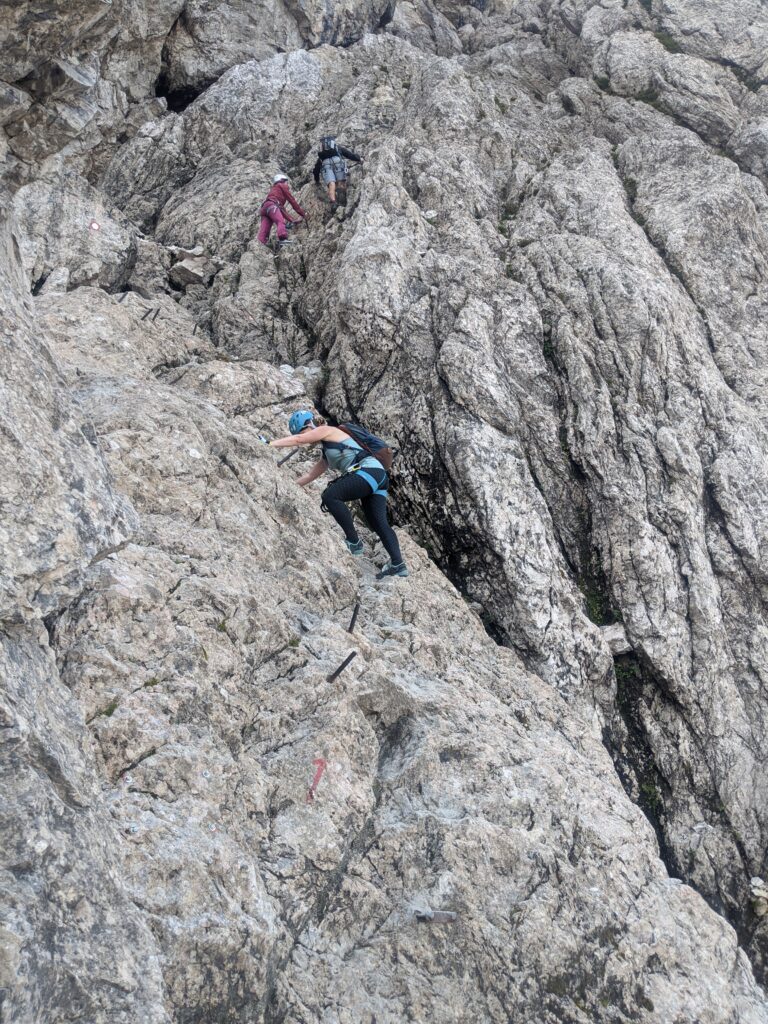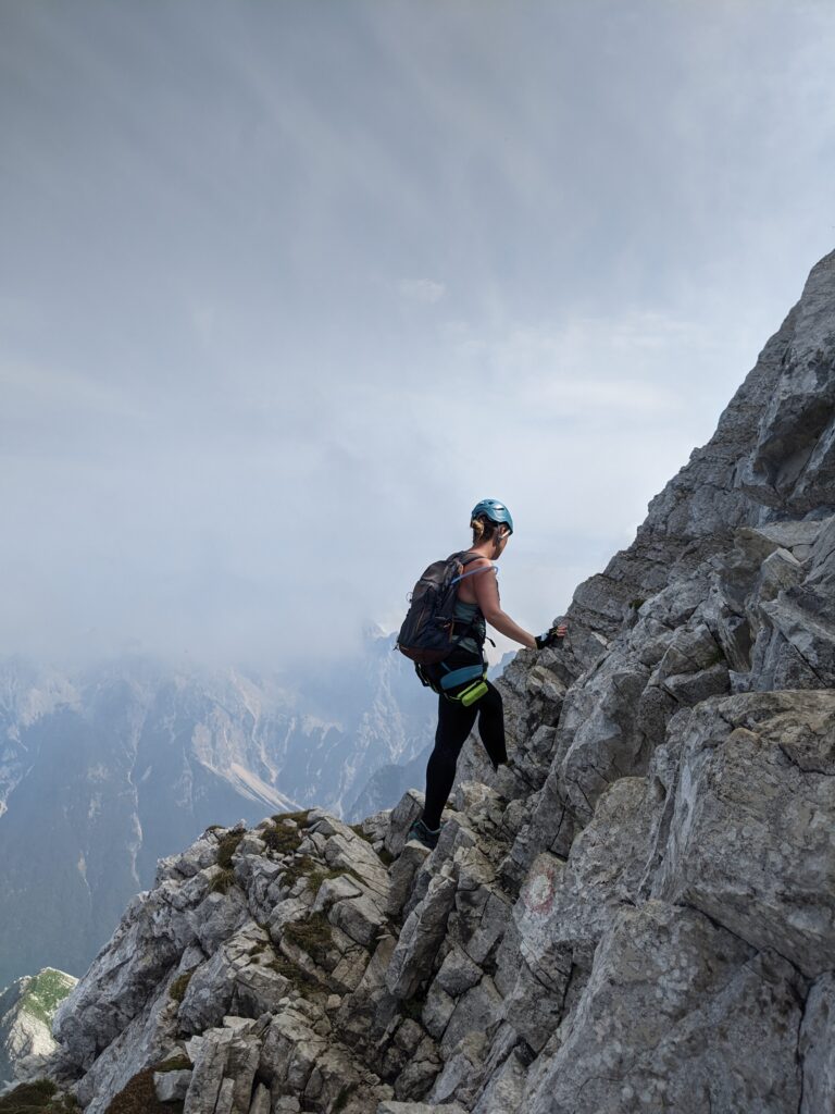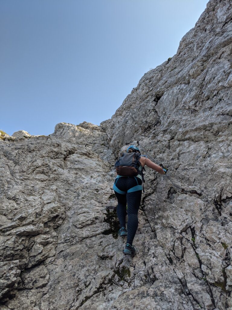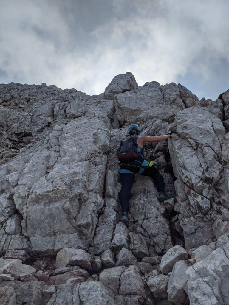 Kolejno znów będziemy wchodzić po ubezpieczonych i nieubezpieczonych fragmentach trasy, a po 10 minutach dotrzemy do bardzo mocno eksponowanej i wąskiej półki skalnej. Jest to kolejny „mocniejszy” fragment ferraty. Bardzo ciekawy i przyjemny, będący zarazem świetnym urozmaiceniem trasy. Następnie będziemy przechodzić kominkiem skalnym, który jest mocno eksponowany i znajduje się na wschodniej ścianie. Po wyjściu z kominka szlak jest równie ciekawy, ponieważ przejść musimy po wąskiej skalnej grzędzie, która nie jest ubezpieczona w żaden sposób. Tu zdani jesteśmy wyłącznie na siebie, na własną równowagę i spokojne przejście blisko ściany 🙂 Kawałek za grzędą skalną, szlak staje się ponownie ubezpieczony, a my skręcamy mocno w lewo i wkraczamy do wysokiego żlebu.