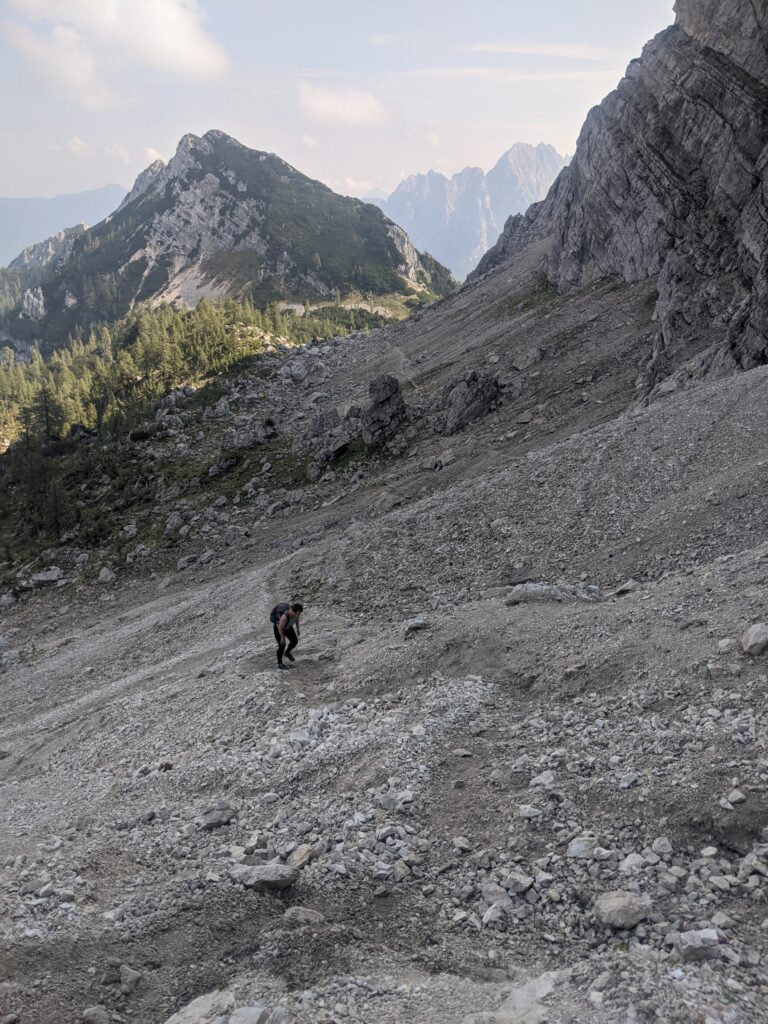 Po wyjściu ze żlebu wkraczamy na piarżystą, momentami niestabilną ścieżkę. Kolejno ścieżka poprowadzi nas przez pasmo kosówki i las do przełęczy Vršič. Tym samym zatoczyliśmy pętlę i zakończyliśmy naszą wycieczkę.