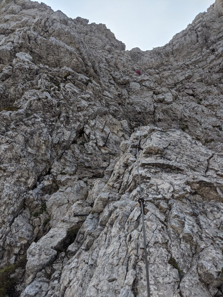 Mniej więcej po 30 minutach od rozpoczęcia wspinaczki, docieramy do miejsca, w którym pokonać musimy niewielki skalny kominek. Kominek nie jest zabezpieczony stalową liną, ma natomiast wspomaganie w postaci metalowych klinów. Pokonanie go nie nastręcza problemów, jednakże jest takim „mocniejszym” fragmentem trasy 🙂 Po wyjściu nad kominek znajdziemy się chwilowo na północno wschodniej stronie Malej Mojstrovki i podchodzić będziemy wzdłuż ubezpieczonej już stalową liną ściany, podczas gdy za stopnie służyć nam będą wyprofilowane metalowe kliny.