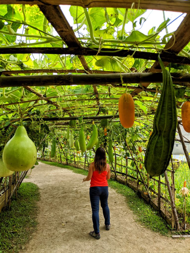 W kolejnych częściach ogrodu są szklarnie, uprawy warzyw i owoców, alejka z wiszącymi kabaczkami (z których w Tajlandii robi się gąbki do mycia ciała!), mała plantacja lotosów, oraz szklarnia z lasem tropikalnym – swoją drogą, znajduje się ona obok prawdziwego lasu tropikalnego 😀