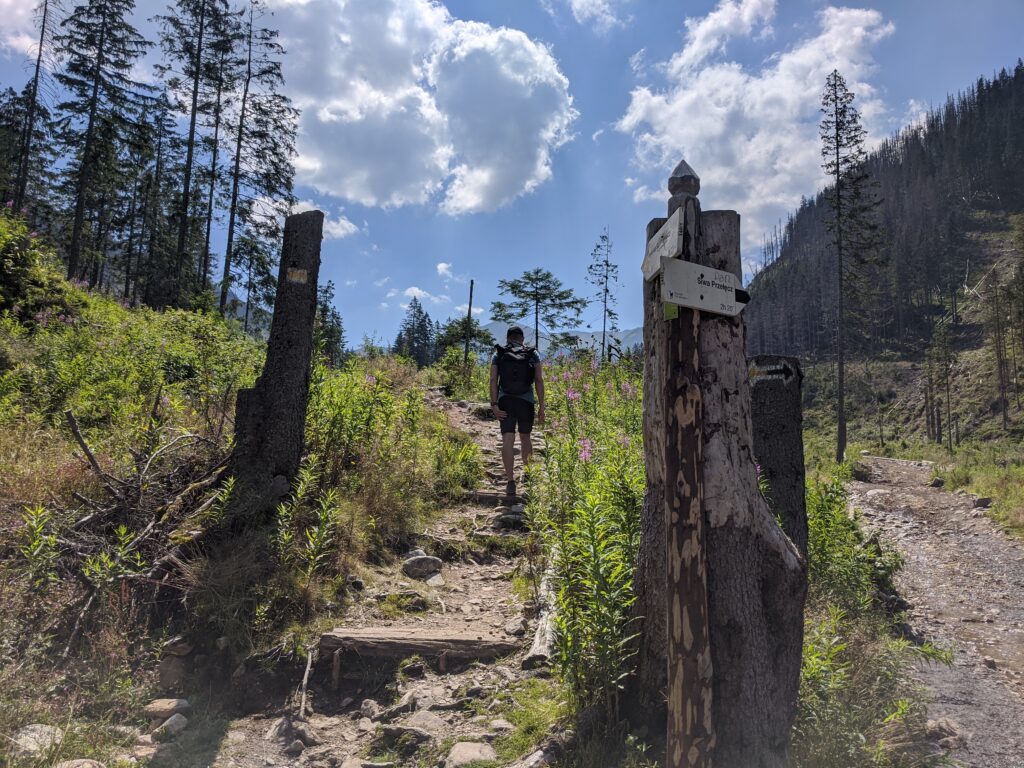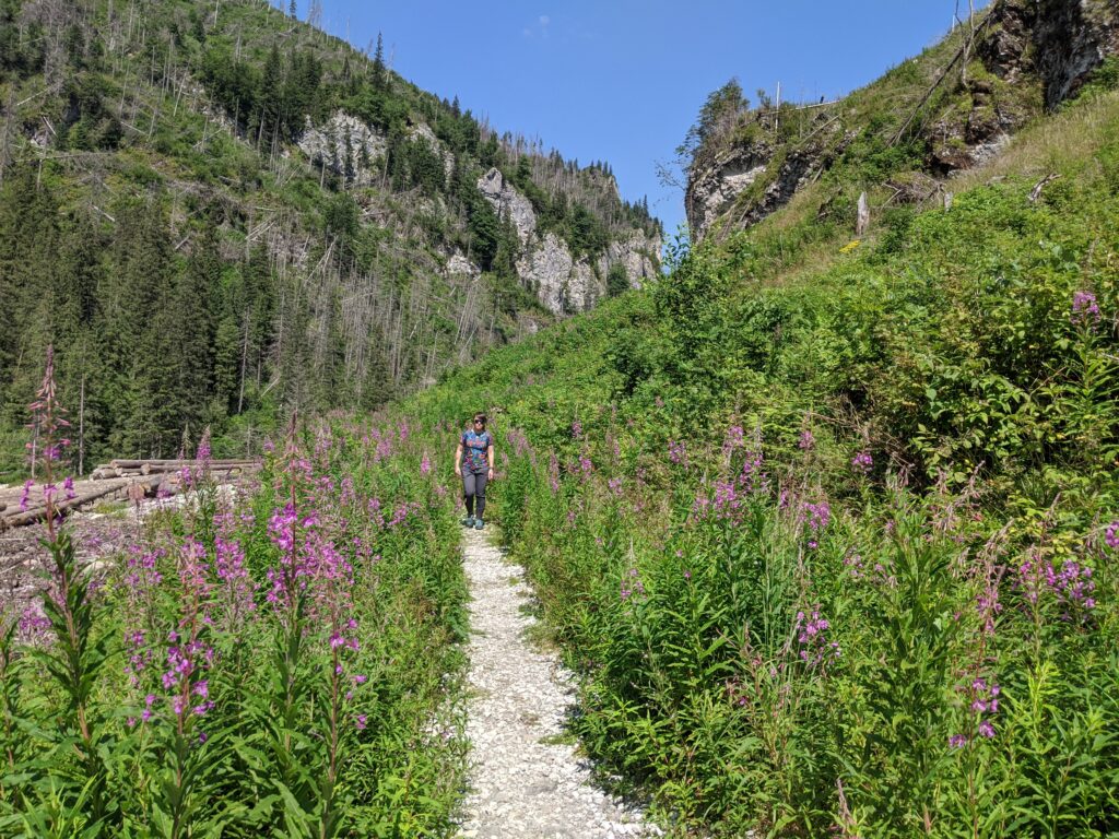 Rozpoczynamy podejście na Iwaniacką Przełęcz (1459 m n.p.m.). Najpierw kroczymy wśród kwitnącej wierzbówki kiprzycy, bardzo wąską, zarastającą ścieżką. Następnie szlak prowadzi nas do lasu i zmienia swój charakter. Pojawiają się skaliste stopnie, które chociaż wygodne, to w upalny dzień dadzą nam popalić. Wędrujemy nimi przez około 50 minut, aż do momentu kiedy dotrzemy na przełęcz. Tam szukamy zacienionego miejsca i odpoczywamy przez około 10 minut, konsumując przy okazji kanapki 🙂
