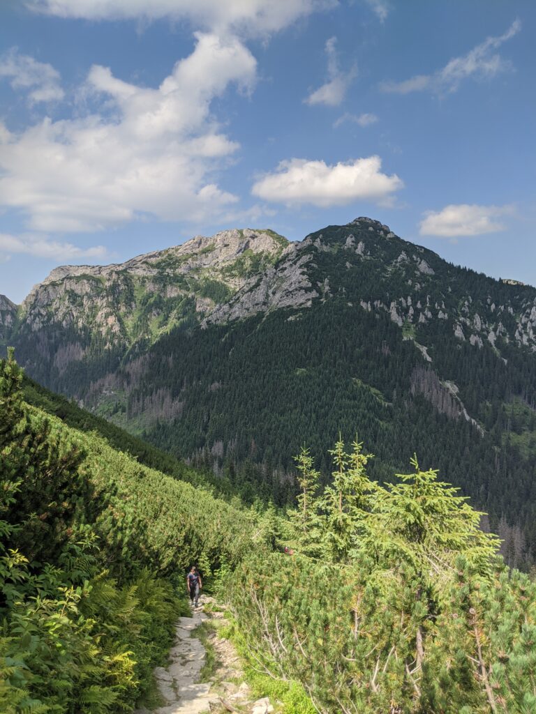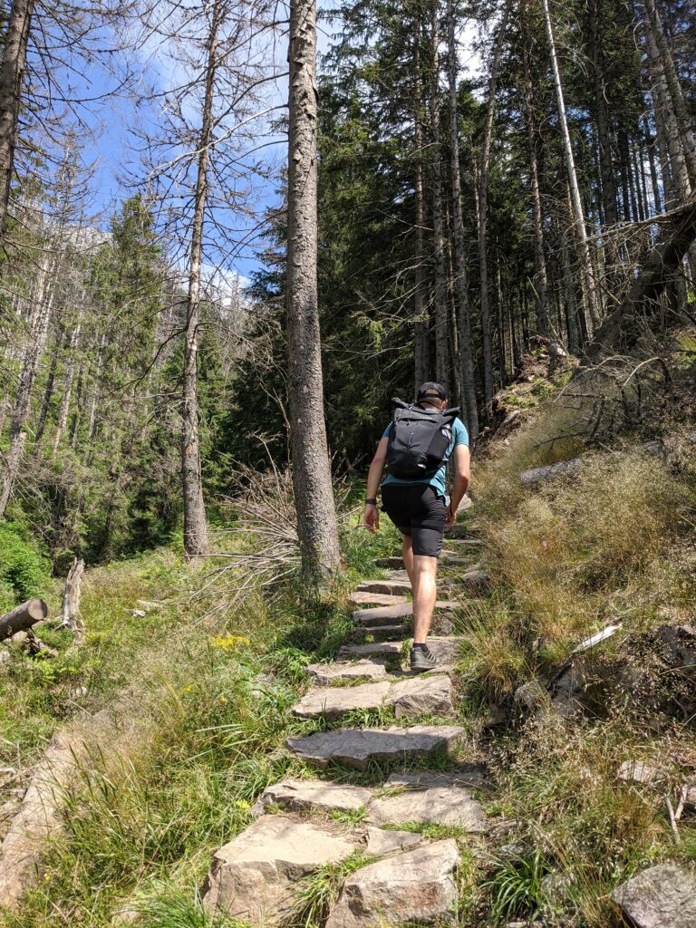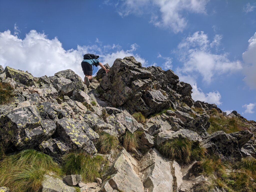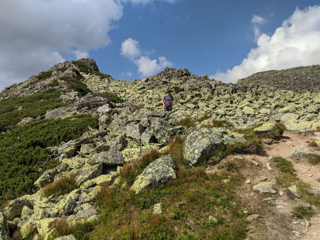 Z Iwaniackiej Przełęczy wybieramy zielony szlak na Ornak. Znaki informują nas, że na szczyt czeka nas 1 godzina 30 minut wędrówki. Nasza trasa do tej pory była mało widokowa, jednakże już za chwilę się to zmieni. Zanim jednak pojawią się pierwsze panoramy, poczujemy spiętą łydkę, solidnie pracujące nogi oraz szybsze bicie serca 🙂 Bowiem na podejściu na Ornak, mamy do pokonania ponad 400 metrów przewyższenia. Szlak na Ornak z Iwaniackiej Przełęczy już od początku pnie się bardzo mocno pod górę, a my szybko nabieramy wysokości. Kroczymy po wysokich skalnych stopniach wśród gęsto rosnącej kosodrzewiny i krzaków borówek. Z każdym krokiem odsłaniają się coraz bardziej rozległe widoki. Pomimo żaru lejącego się z nieba i dużego wysiłku, uśmiech nie schodzi z twarzy.