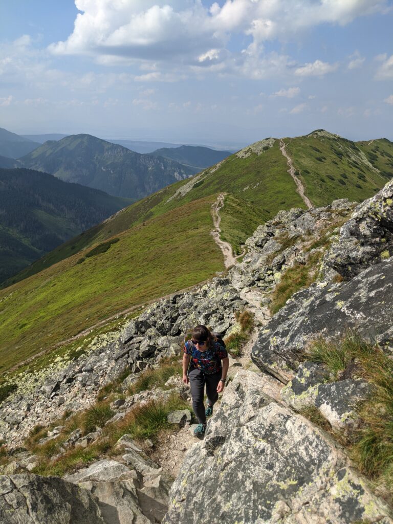 Z Ornaku kierujemy się dalej wyznaczonym szlakiem ku Ornaczańskiej Przełęczy, tracąc na wysokości, a następnie zmierzamy ku skalistemu Zadniemu Ornakowi oraz Siwym Skałom. Zadni Ornak jest najwyższym spośród wszystkich szczytów znajdujących się w grzbiecie Ornaku. Liczy sobie 1867 m n.p.m., i swoją skalistą budową, zdecydowanie wyróżnia się na tle pozostałych wzniesień. Wędrując przez ten szczyt, zalecam trzymać się oznaczeń na szlaku. Właściwa droga prowadzi prawie przez sam szczyt Zadniego Ornaku, podczas gdy „alternatywne” wydeptane obok ścieżki mogą mocno nas zmylić. Zadni Ornak jest jedynym miejscem na całej naszej trasie, gdzie do pokonania jest skaliste podejście oraz skaliste, momentami strome zejście.