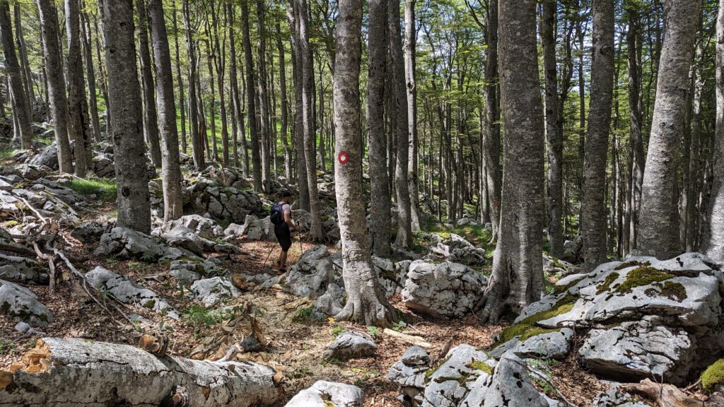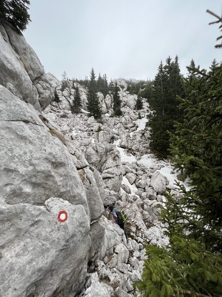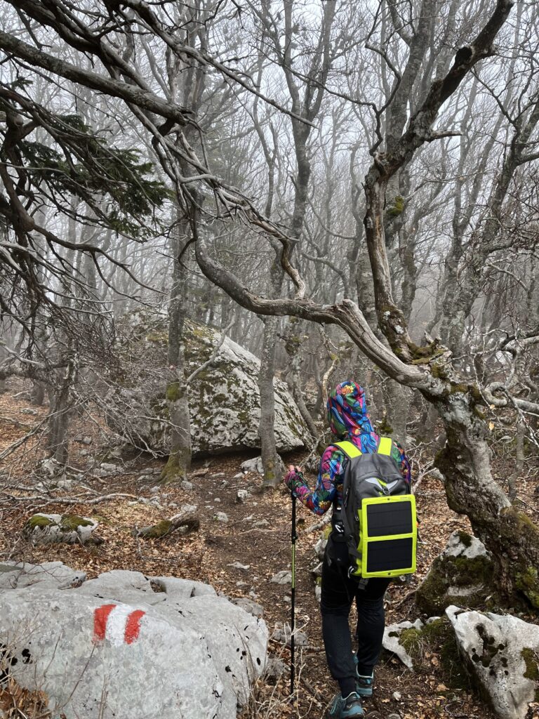 Podczas wędrówki maszerujemy zarówno łatwymi leśnymi ścieżkami, skalistymi kominkami, w których trzeba się trochę wspomagać rękami, jak i skalnym chodnikiem wytyczonym pomiędzy wysokimi, wapiennymi skałami. Całość robi ogromne wrażenie i z pewnością przy lepszej aurze szlak prezentuje się jeszcze piękniej! Wędrówka jest długa i momentami wymaga braku czułości na ekspozycję. Warto zabrać kije trekkingowe i przygotować się na pokonywanie fragmentów szlaku, gdzie trzeba asekurować się rękami. Są tu też wąskie przejścia pomiędzy skałami, czy wędrówka klimatycznym lasem. Zabierzcie koniecznie zapas wody i prowiantu. Po drodze nie ma żadnego schroniska!
