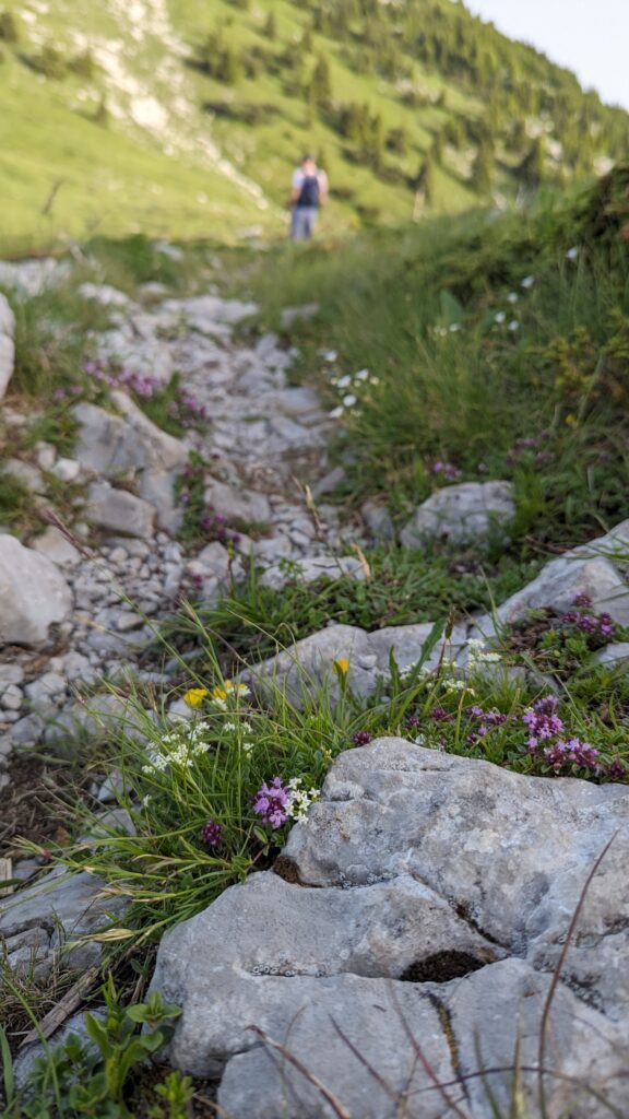 Schodzimy ponownie pod schronisko i ścieżką 11.10 podążamy najpierw wśród skał, później przez las. Na skrzyżowaniu skręcamy w lewo na ścieżkę 11.11. Podchodzimy przez las, wychodzimy na zieloną łąkę, którą porasta obłędna ilość kolorowych kwiatów. Na kolejnym skrzyżowaniu skręcamy w lewo i podchodzimy w stronę schroniska.