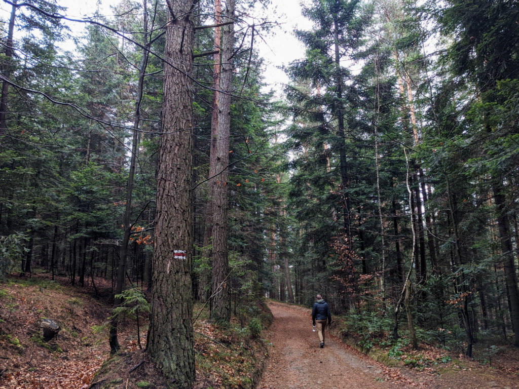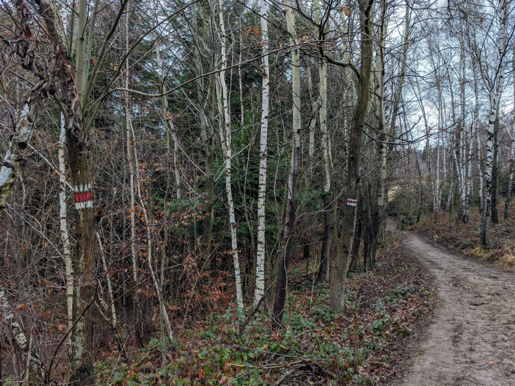 Początkowo czerwony szlak z Działek biegnie szosą. Mijamy po lewej stronie łąki oraz prywatne posesje z domkami. Po kilku minutach skręcamy z szosy w lewo i wkraczamy do lasu.