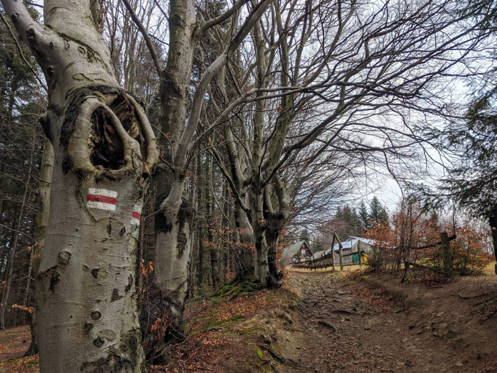Odtąd nasz szlak będzie biegł cały czas przez las. Maszerujemy leśną ścieżką, powoli nabierając wysokości. Po dwudziestu minutach od rozpoczęcia marszu skręcamy ostro w lewo, zgodnie ze znakami, które namalowane są na drzewach. Z tego miejsca czeka nas jeszcze około 15 minut wędrówki przez las, aż dotrzemy do schroniska PTTK na Kudłaczach. W związku z tym, że opisany szlak jest dość krótki, już po 40 minutach wolnego marszu docieramy do schroniska.