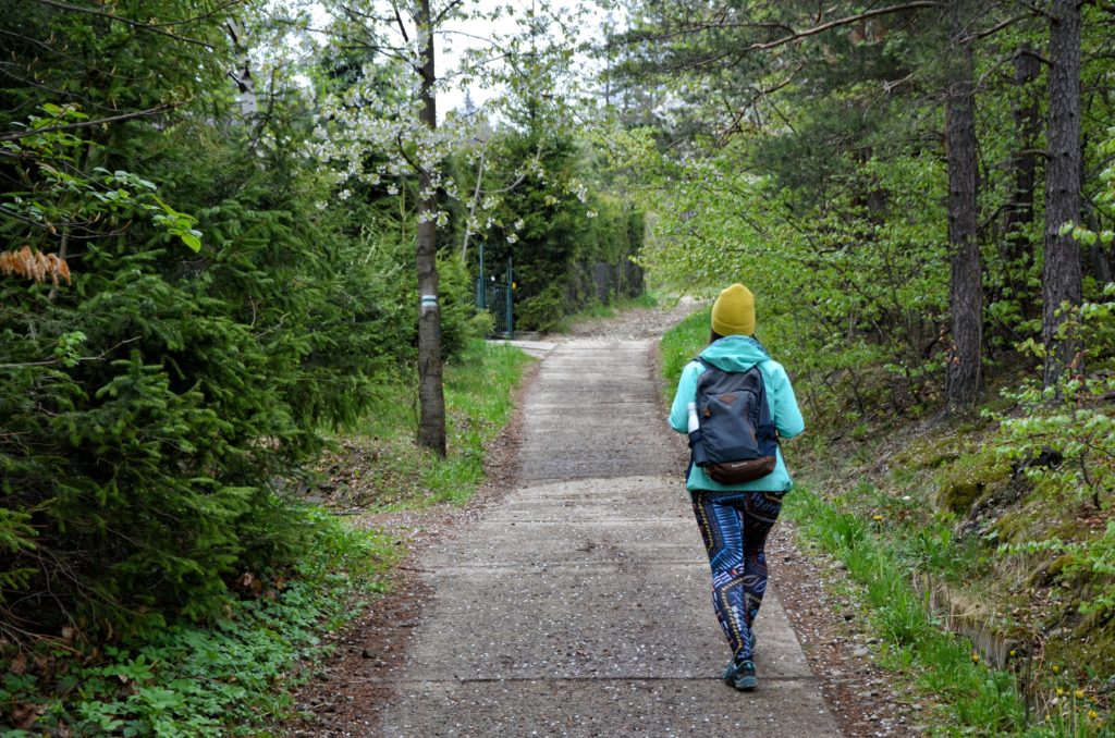 Początkowo szlak prowadzi betonową dróżką dojazdową do domków letniskowych. Domki mamy po lewej stronie, natomiast po prawej stronie rozciągają się widoki na Mszanę Dolną. Za to za naszymi plecami pięknie prezentuje się widok na Luboń Wielki i zlokalizowane na jego szczycie schronisko oraz wieżę. Po kilku minutach marszu betonowa droga zamienia się w ubitą, leśną ścieżkę, która usłana jest sporą ilością materiału skalnego. Wędrujemy wygodną trasą, stopniowo nabierając wysokości. Szlak raz prowadzi mocniej pod górę, raz wiedzie bo względnie płaskim terenie.
