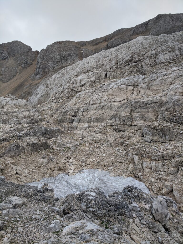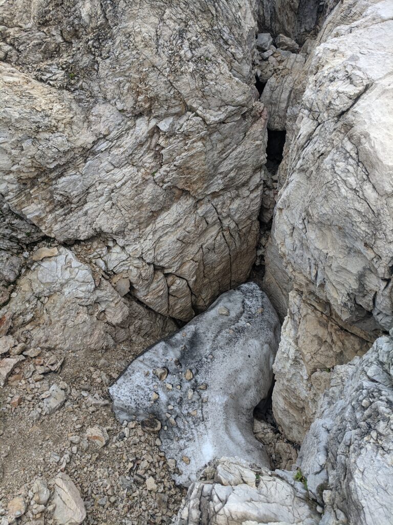 Odtąd nasza wędrówka zmieni swój charakter na znacznie łagodniejszy. Będziemy maszerować rozległą doliną lodowcową, która pocięta jest licznymi szczelinami. Dlatego też zalecam podczas przemierzania tej części szlaku patrzeć pod nogi. Niektóre szczeliny są naprawdę głębokie! Teren, którym kroczymy jeszcze do niedawna pokrywał Triglavski ledenik, czyli lodowiec, który znajdował się pod północną ścianą Triglava. Obecnie szczątki lodowca zaobserwować można na wysokości 2400-2500 m n.p.m. Jego powierzchnia wynosi mniej niż 1 hektar, podczas gdy jeszcze w połowie XIX wieku pokrywa lodowca miała powierzchnię 46 hektarów. Z tego powodu w dzisiejszych czasach można lodowiec śmiało nazwać lodowczykiem lub szczątkowym lodowcem. Regularne pomiary pokrywy śnieżnej i obserwacje lodowczyka prowadzi się tu od 1946 roku.