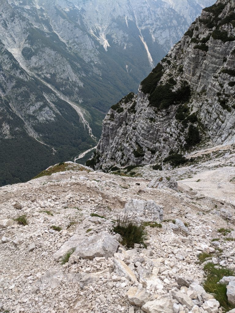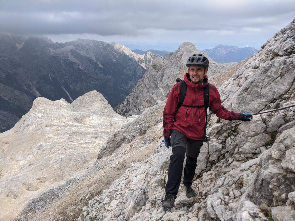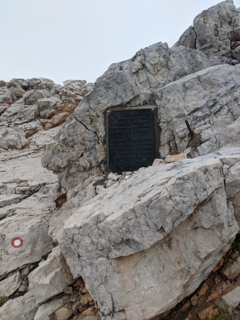 Po 30 minutach wspinaczki docieramy na ostrą grań, którą wejdziemy najpierw na Mały Triglav, a następnie na Triglav. Miejsce jest bardzo mocno eksponowane. Kroczymy wąską ścieżką, wzdłuż której zamontowane są metalowe paliki i poprowadzona stalowa lina. Z obu stron mamy przepaść — naprawdę jest gdzie polecieć, dlatego też zalecam zachować dużą ostrożność. Co jakiś czas na trasie pojawiają się symboliczne tabliczki z imieniem, nazwiskiem i datą śmierci osób, które straciły tu życie. Patrząc na nie, nasza czujność jeszcze bardziej wzrasta.