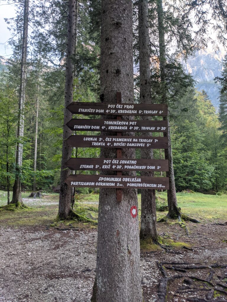 Wędrówkę na Triglav rozpoczynamy na parkingu samochodowym nieopodal schroniska Aljažev dom v Vratih. Koszt parkingu za cały dzień, to 3.5€ (wrzesień 2020). Z parkingu kierujemy się ścieżką w stronę schroniska. Następnie zgodnie ze znakami, ruszamy w kierunku ferraty Tominškova pot: Stanicev dom – Kredarica – Triglav. Nasza trasa w jedną stronę jest dedykowana na 5 godzin 30 minut. Po kilku minutach marszu docieramy do charakterystycznego pomnika Poległych Partyzantów. Tu skręcamy w lewo, w kierunku Tominškova pot, przecinając potok i wkraczamy do lasu.