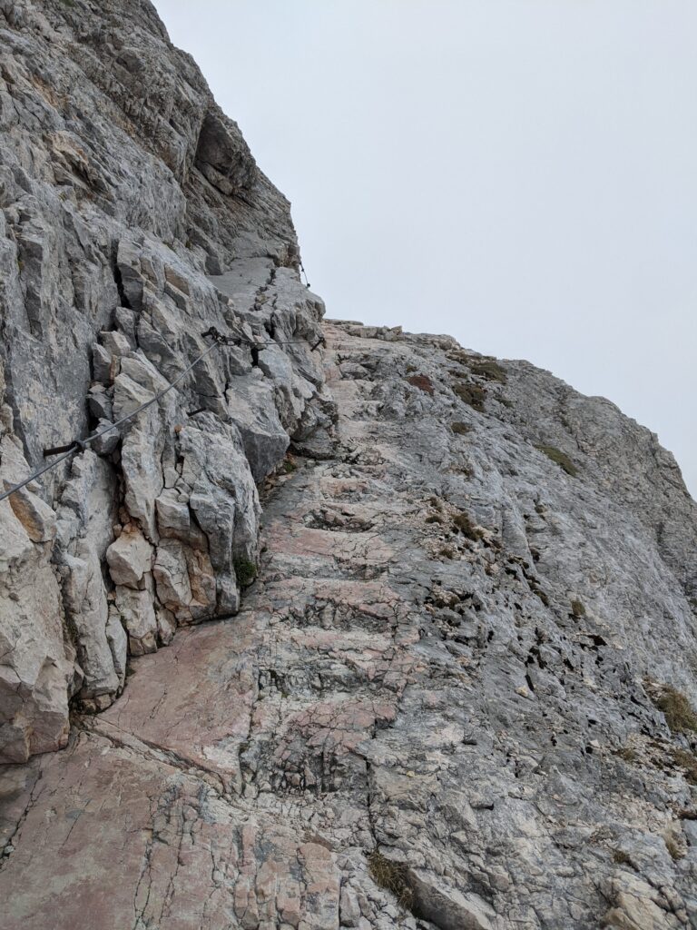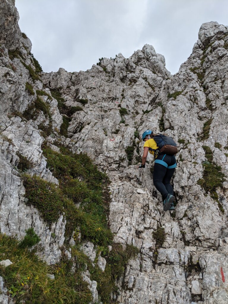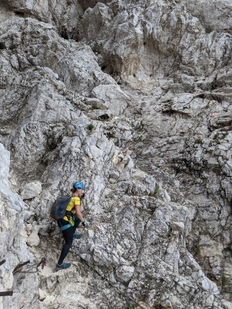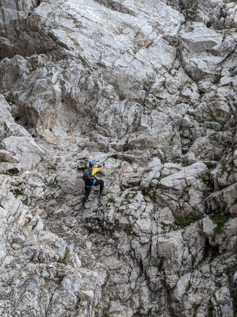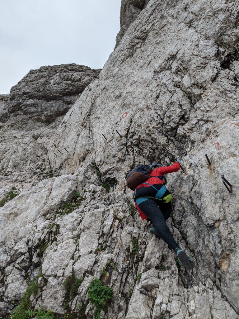 Wspinamy się po mocno eksponowanej ścianie. Na pierwszy rzut oka ciężko jest dostrzec, jak poprowadzony jest szlak. Po chwili jednak już sprawnie pokonujemy kolejne fragmenty trasy. Szlak prowadzi nas zarówno po wąskich półkach skalnych jak i po pionowych ścianach, gdzie musimy użyć dużej siły rąk. Trawersujemy północne zbocza i dość szybko nabieramy wysokości. Co jakiś czas znikają metalowe ubezpieczenia i zdani jesteśmy tylko na siebie i swoje umiejętności poruszania się w takim terenie.