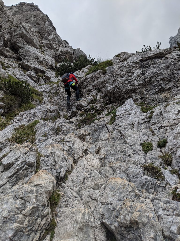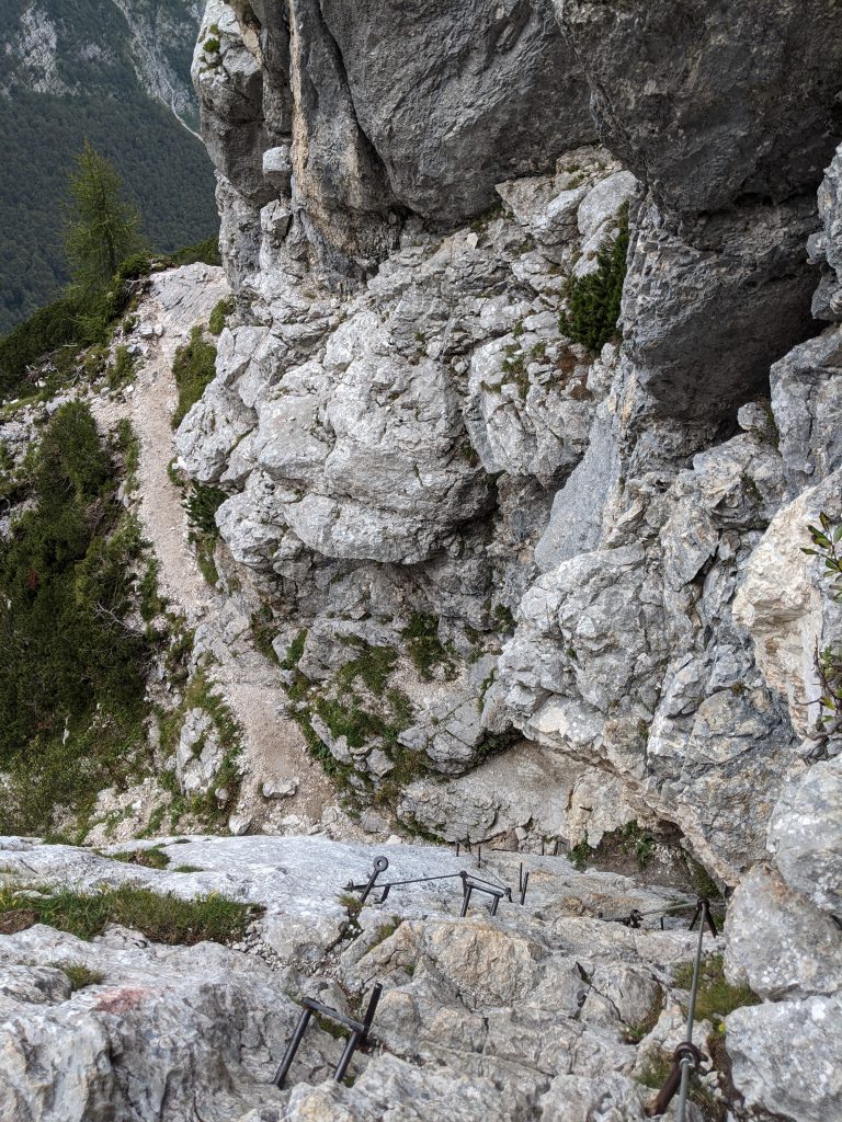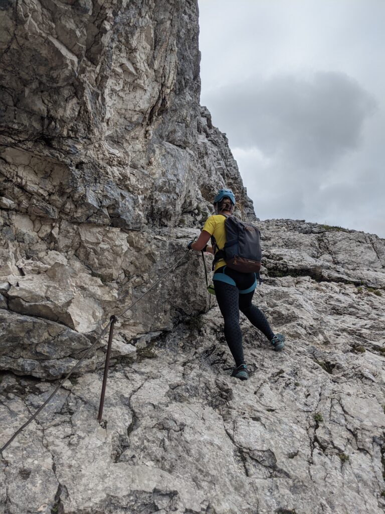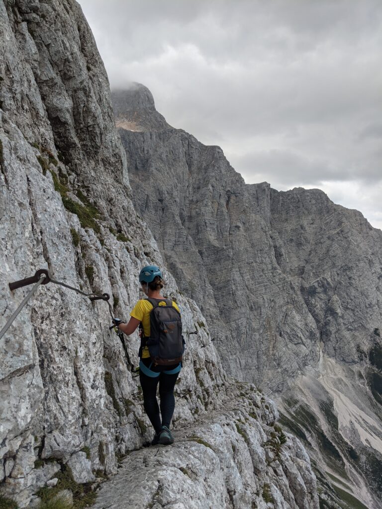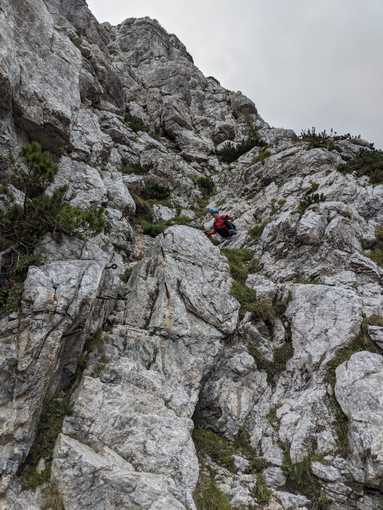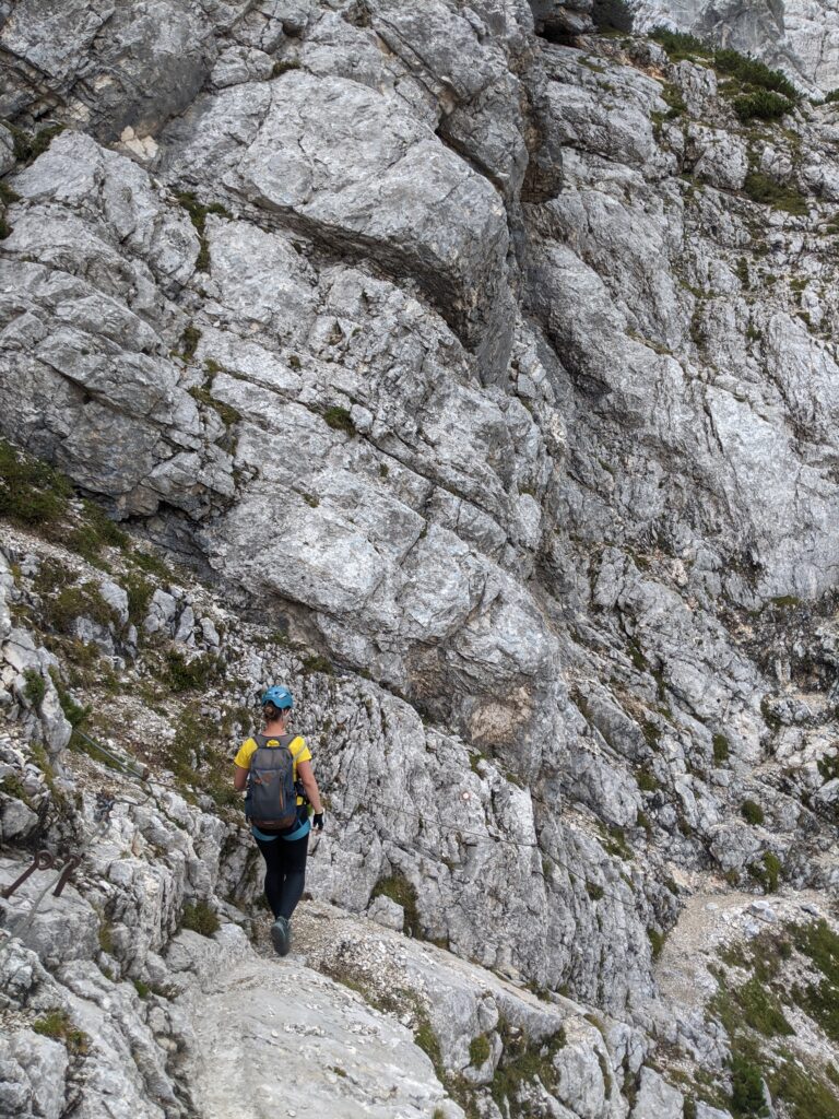 Wspinamy się po mocno eksponowanej ścianie. Na pierwszy rzut oka ciężko jest dostrzec, jak poprowadzony jest szlak. Po chwili jednak już sprawnie pokonujemy kolejne fragmenty trasy. Szlak prowadzi nas zarówno po wąskich półkach skalnych jak i po pionowych ścianach, gdzie musimy użyć dużej siły rąk. Trawersujemy północne zbocza i dość szybko nabieramy wysokości. Co jakiś czas znikają metalowe ubezpieczenia i zdani jesteśmy tylko na siebie i swoje umiejętności poruszania się w takim terenie.