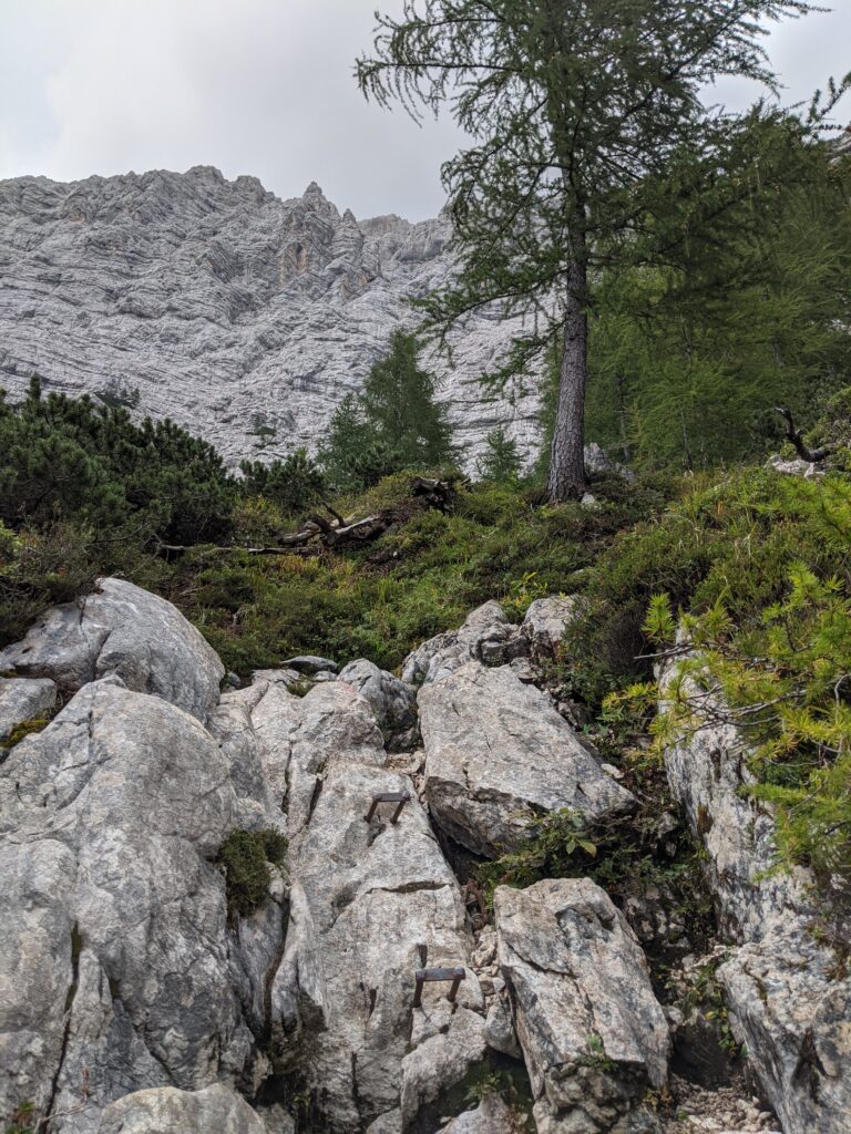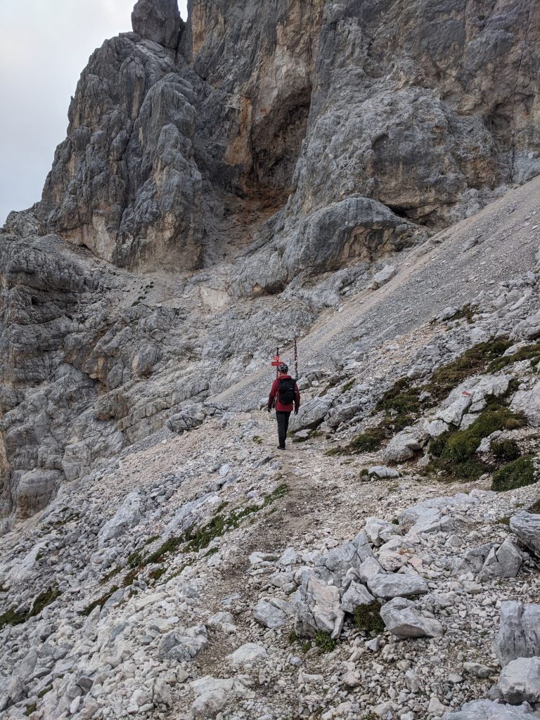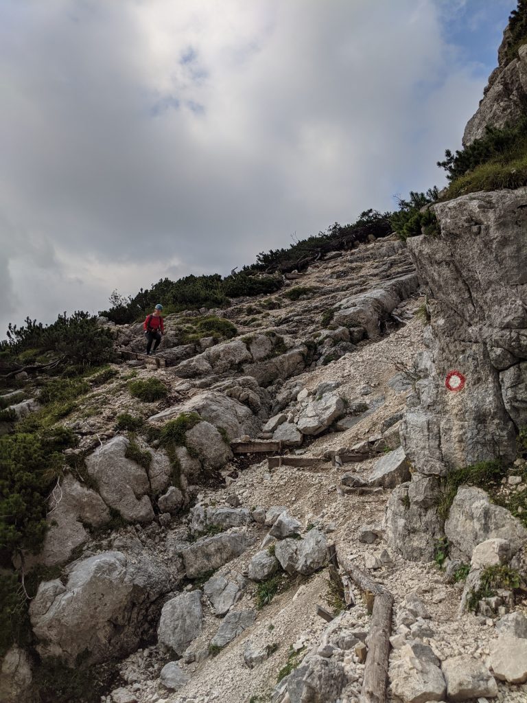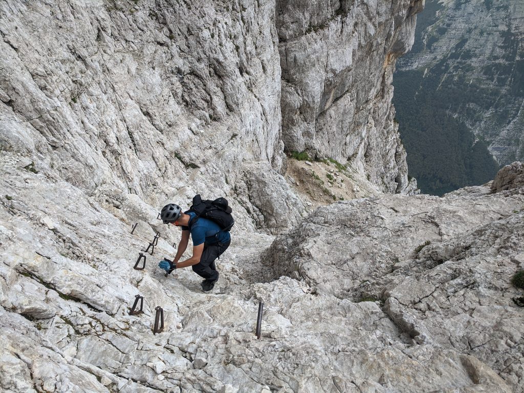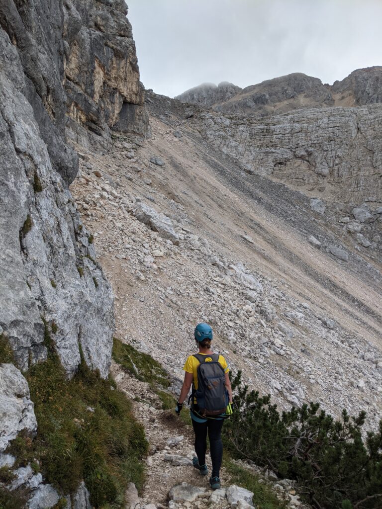 Wspinamy się po mocno eksponowanej ścianie. Na pierwszy rzut oka ciężko jest dostrzec, jak poprowadzony jest szlak. Po chwili jednak już sprawnie pokonujemy kolejne fragmenty trasy. Szlak prowadzi nas zarówno po wąskich półkach skalnych jak i po pionowych ścianach, gdzie musimy użyć dużej siły rąk. Trawersujemy północne zbocza i dość szybko nabieramy wysokości. Co jakiś czas znikają metalowe ubezpieczenia i zdani jesteśmy tylko na siebie i swoje umiejętności poruszania się w takim terenie.
