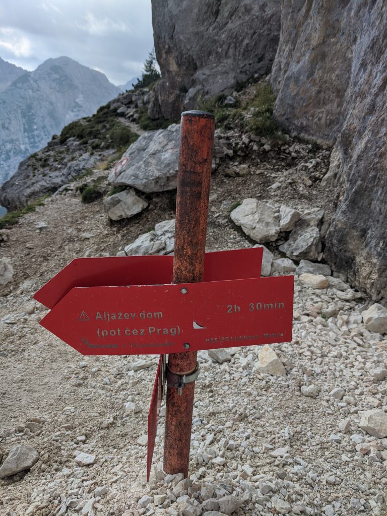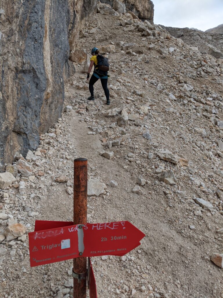 Początkowo od schroniska schodzimy ścieżką w dół, pod wschodnią ścianę Triglava. Po chwili ponownie podchodzimy pod górę i rozpoczynamy wspinaczkę po metalowych klinach. Następnie docieramy do czerwonej tabliczki z napisem „zavarovana plezalna pot” czyli „zabezpieczona droga wspinaczkowa”. Ostatni etap podejścia na Triglav, prawie cały czas będzie ubezpieczony stalową liną oraz metalowymi klinami. Wspinając się, bardzo szybko nabieramy wysokości. Trasa jest bardzo mocno eksponowana, a ścieżka bardzo wąska. Szczerze mówiąc, nie wyobrażam sobie, jak wygląda ta trasa w szczycie sezonu, kiedy osoby idące z dołu muszą mijać się z osobami schodzącymi w dół.