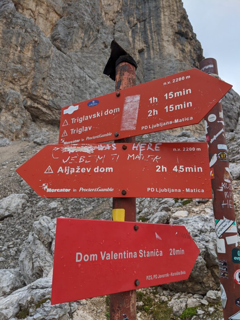 Znaki przy schronisku informują nas, że na szczyt mamy jeszcze godzinę wędrówki. W rzeczywistości wejście zajęło nam 1 godzinę 15 minut, a na trasie było pusto. Jednakże chmura, która otuliła Triglav nie dała za wygraną. Z tego powodu musieliśmy wspinać się na szczyt dość wolno i mieć oczy dookoła głowy.