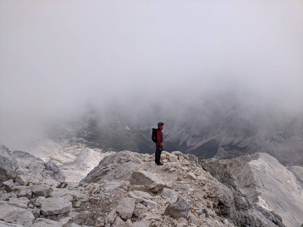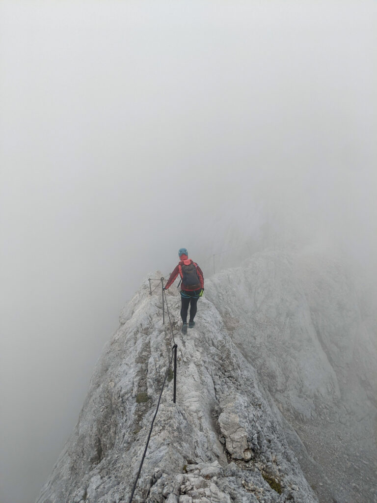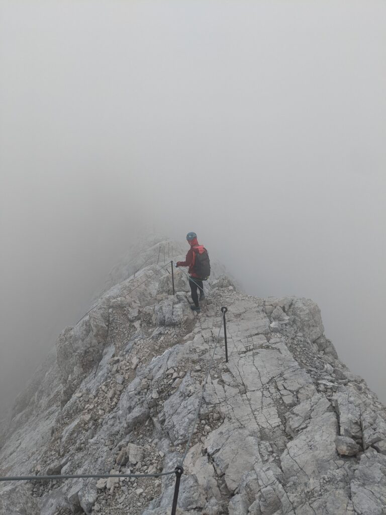Kroczymy wąską granią przez kolejne minuty. Chmura niestety nie odpuszcza, dlatego chwilę postanawiamy przeczekać po południowej stronie. Ruszamy kilka minut później, kiedy chmura przechodzi, a widoczność wzrasta. Trasa prowadzi nas raz w górę, raz w dół. Omijamy mniejsze i większe turniczki, to z lewej, to z prawej strony. Grań cały czas jest bardzo wąska. Pojawiają się także momenty, gdzie szlak nie ma żadnych zabezpieczeń. Wreszcie, zza wszechobecnej mgły wyłania się zarys wieży Aljazev stolp, tym samym dając nam znać, że docieramy na szczyt.