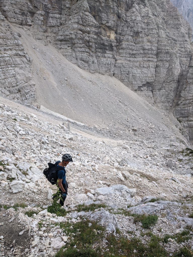 Po zejściu ze ściany ponownie wkraczamy na sypiącą się ścieżkę. Przez kolejne 1.5 godziny będziemy schodzić w dół. Szlak znów na zmianę będzie albo z ubezpieczeniami, albo bez. Trasa wydaj się nie mieć końca, szczególnie że praktycznie cały czas widzimy już dno doliny wraz z płynącym nią potokiem.