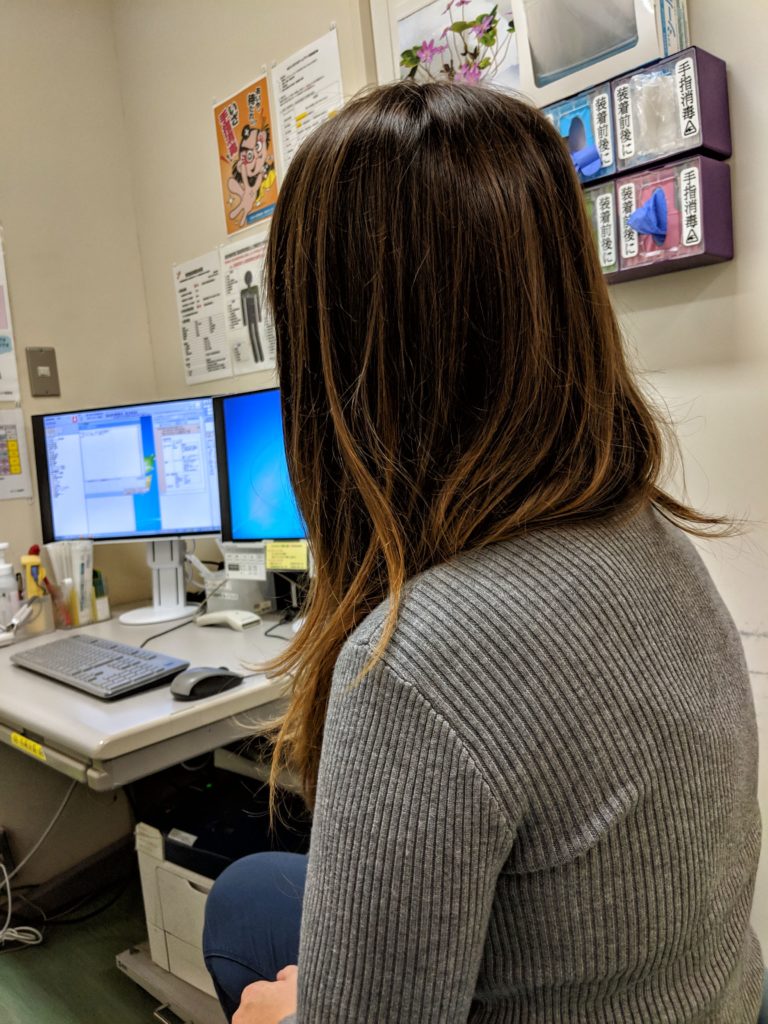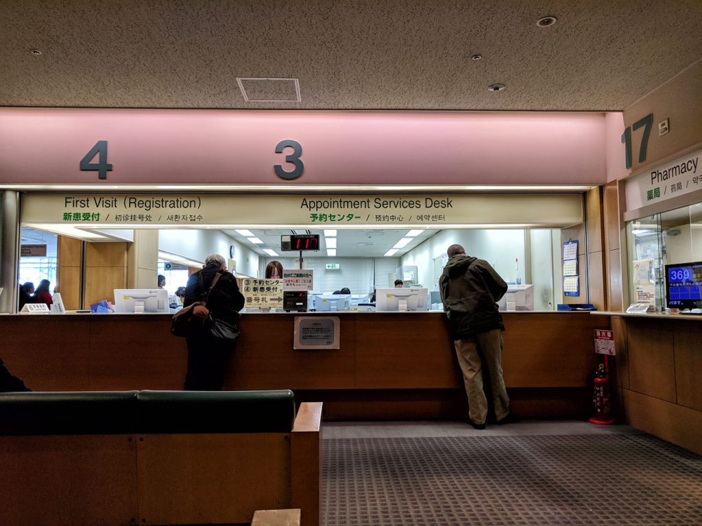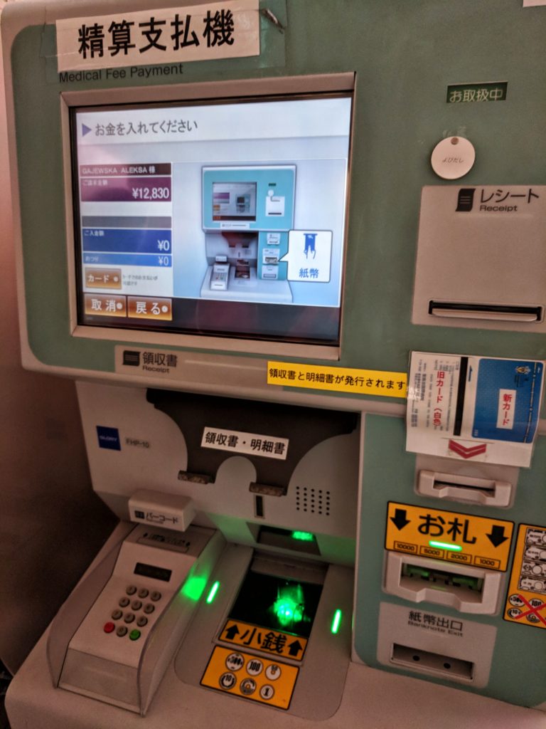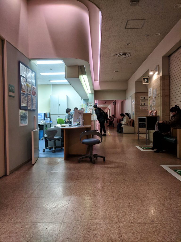 Po wejściu do placówki skierowałam się do okienka o nazwie “first visit”, przedstawiłam problem z jakim przyszłam (bolesna infekcja gardła) i poprosiłam o przyjęcie mnie przez lekarza pierwszego kontaktu (GP – general practitioner). Podałam swój paszport, który pani z rejestracji skopiowała i w języku japońskim napisała na kopii moje dane (ułatwiło to wymowę mojego imienia i nazwiska na późniejszym etapie wizyty). Pokazałam ubezpieczenie i skontaktowaliśmy się jeszcze telefonicznie z pracownikiem szpitala, aby potwierdzić ważność ubezpieczenia i ustalić, że koszt wizyty pokrywamy na miejscu i sami będziemy ubiegać się o zwrot od ubezpieczalni. Następnie dostałam kartę szpitalną, taką jakby kartę stałego i zostałam poproszona o przejście na oddział “emergency”.