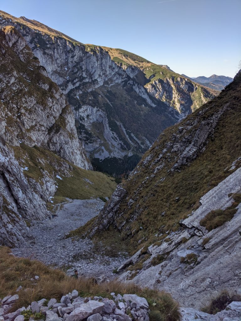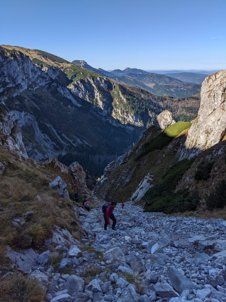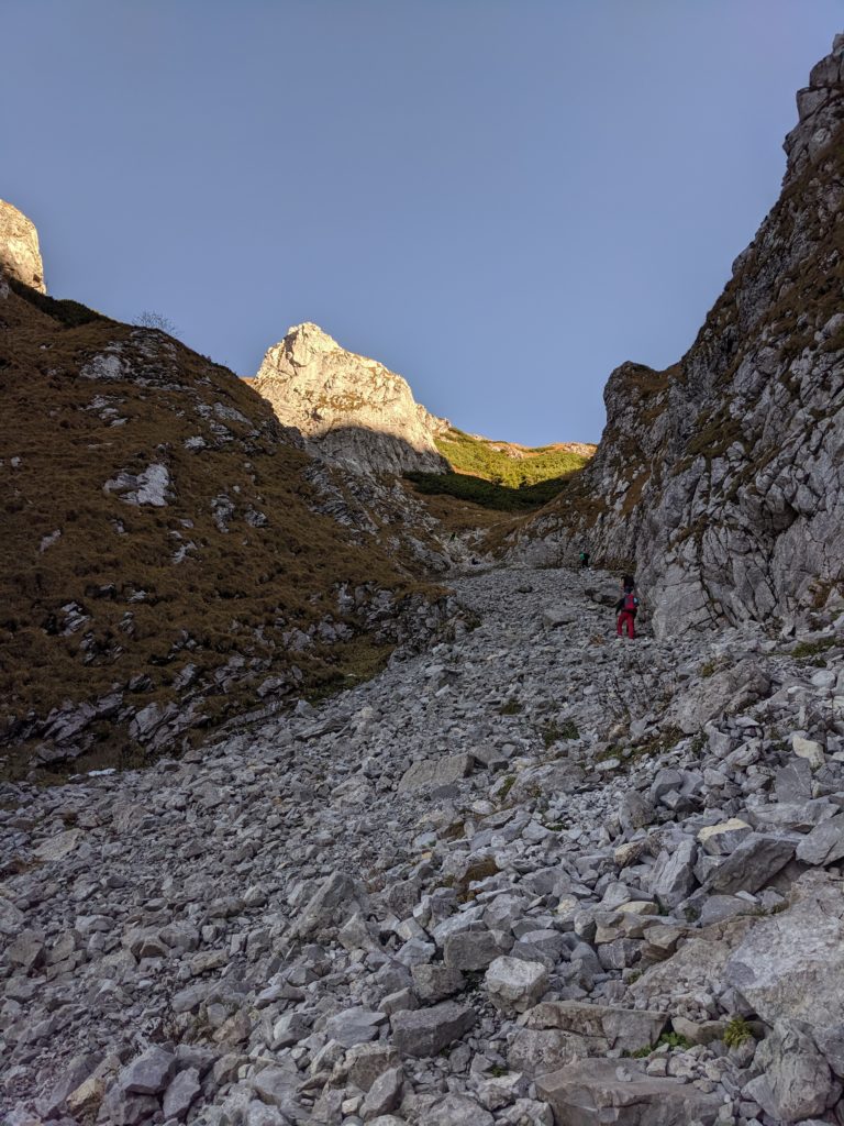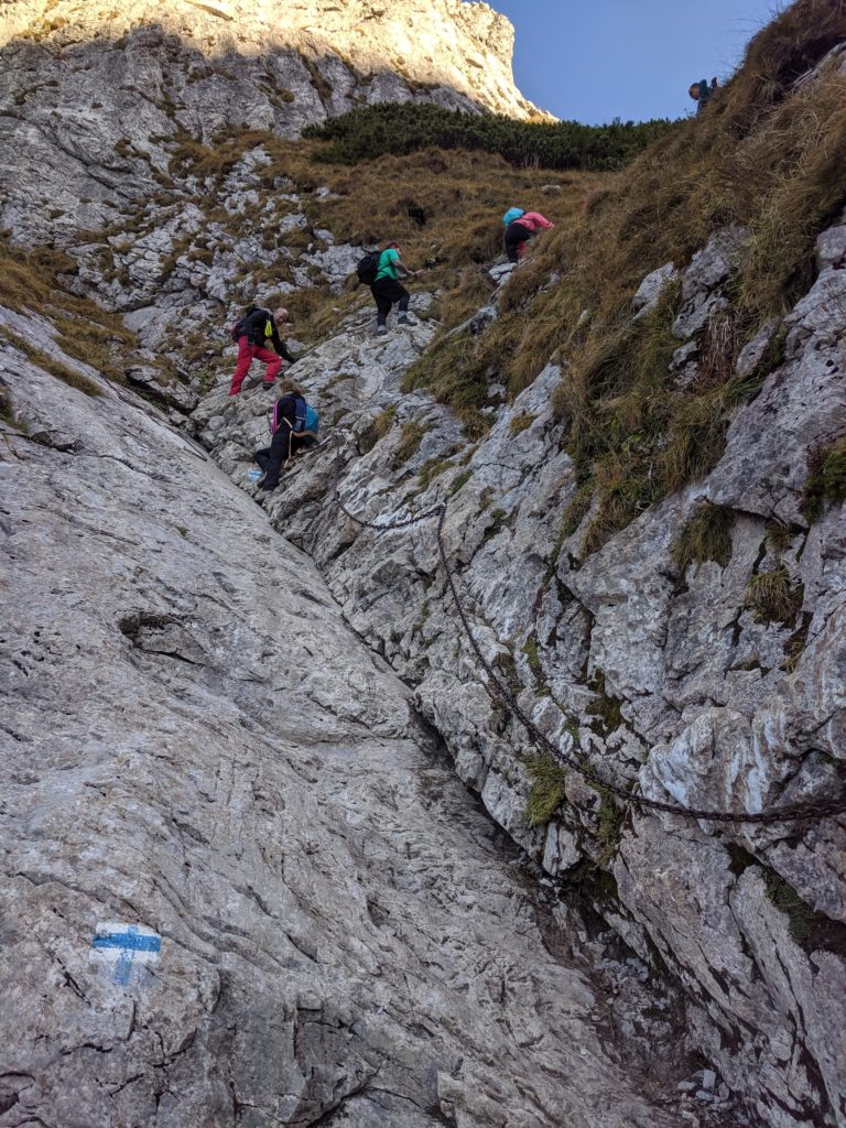 Trasa staje się jeszcze bardziej stroma. Maszerujemy pod górę po wygodnych kamiennych stopniach ułożonych wśród rumowiska skalnego. Ponieważ podążamy dnem żlebu po naszej prawej i lewej stronie znajdują się wysokie i strome ściany. Technicznie nie ma tu nic trudnego, natomiast tętno z pewnością przyspieszy. 10-15 minut później docieramy do skalnej płyty, która ubezpieczona jest łańcuchami. Są to jedyne sztuczne ułatwienia na naszej trasie. Łańcuchy znacznie ułatwiają przejście tego odcinka i wspięcie się po płycie (przynajmniej w moim odczuciu 😉 ). Ze względu na to, że ten fragment szlaku jest dość „wyślizgany”, a niektóre skały „wypolerowane” polecam pokonywać go spokojnie i bez pośpiechu. Fragment sam w sobie nie jest trudny, aczkolwiek należy zachować ostrożność.