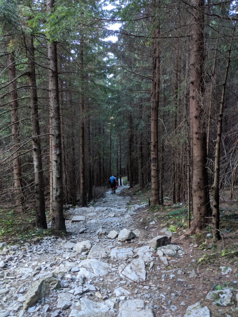 Początkowo szlak biegnie wśród pasma kosówki, rumowisk skalnych i żłobków krasowych. Maszerujemy 40 minut i wkraczamy do lasu, a po upływie kolejnych 10 minut docieramy do Wielkiej Polany Małołąckiej.