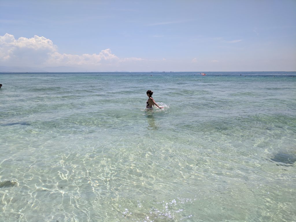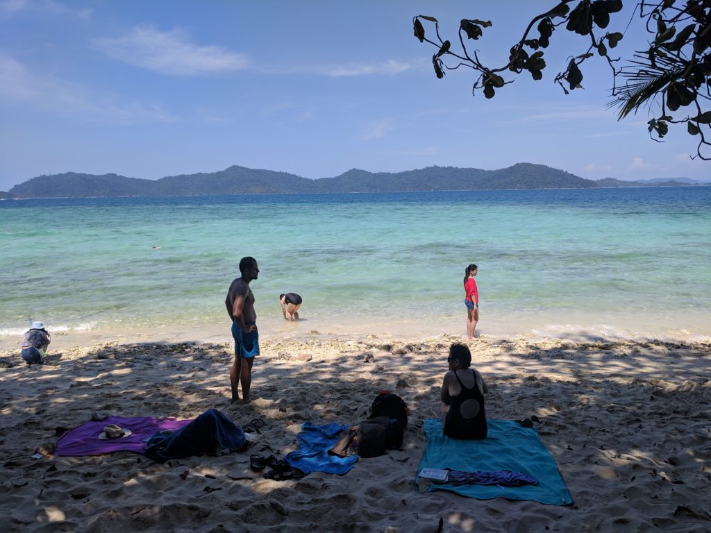 Wyspa Mamutik jest najmniejszą spośród wysp w parku. Tym samym okazała się być (może przypadkiem) bardzo spokojną. Po godzinie 13 kiedy przypłynęliśmy było dość mało ludzi, nie grała głośna muzyka, brak było pisków i krzyków. Bardzo przyjemne miejsce. Bez problemu znaleźliśmy kącik w cieniu drzew na plaży, gdzie można było oddać się błogiemu leżakowaniu lub czytaniu książki, kąpieli w morzu i bujania na falach. Ale uwaga, przy brzegu są skały i kawałki rafy koralowej, zalecam więc wchodzić do wody bardzo ostrożnie, bo o ubicie palca nie trudno 😉