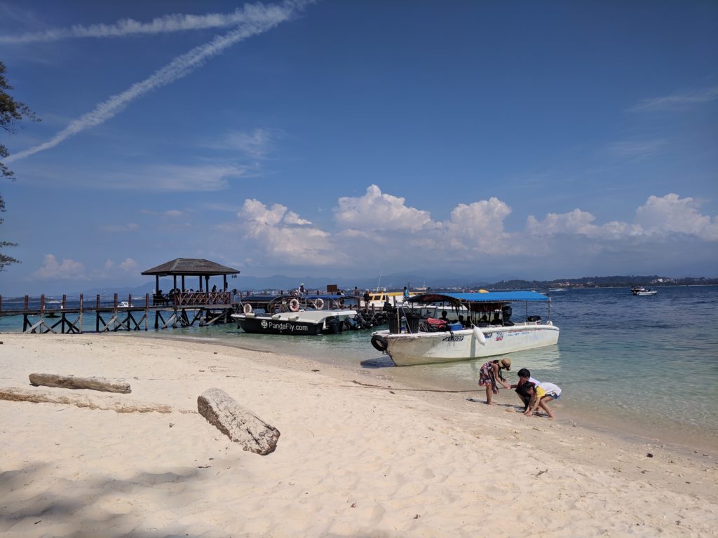 Manukan okazała się być wyspą dość oblężoną przez turystów. Było tam sporo osób, a ceny jedzenia bardzo wygórowane, dlatego jeśli nie chcecie przepłacać to weźcie sobie przekąski ze sobą 😉 Wszystko jednak wynagradza piękna piaszczysta plaża i przezroczysta woda. Odchodząc kawałek od przystani można znaleźć pustą plażę i skrawek morza tylko dla siebie. Na Manukan zabawiliśmy około 2 godzin i przeprawiliśmy się motorówką na wyspę Mamutik. Transfer trwał około 5 minut.