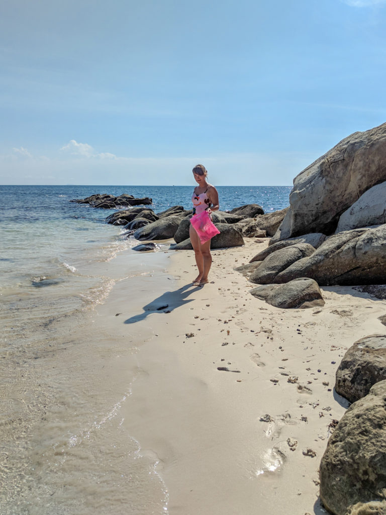 Na wyspie poza jej piaszczystą częścią można znaleźć także skalistą plażę, która wyglądem przypomina Seszele 😉 Plaża znajduje się po prawej stronie od molo (patrząc w jego stronę).